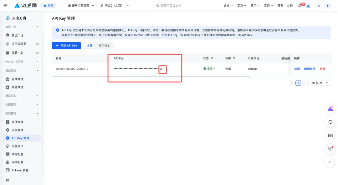 - 然后你就可以在,就是接下来这个页面里面去复制你的 API Key 了,还是点击小眼睛之后会出现密码和复制按钮。API Key 千万不要告诉别人,这个就是你的密码。
