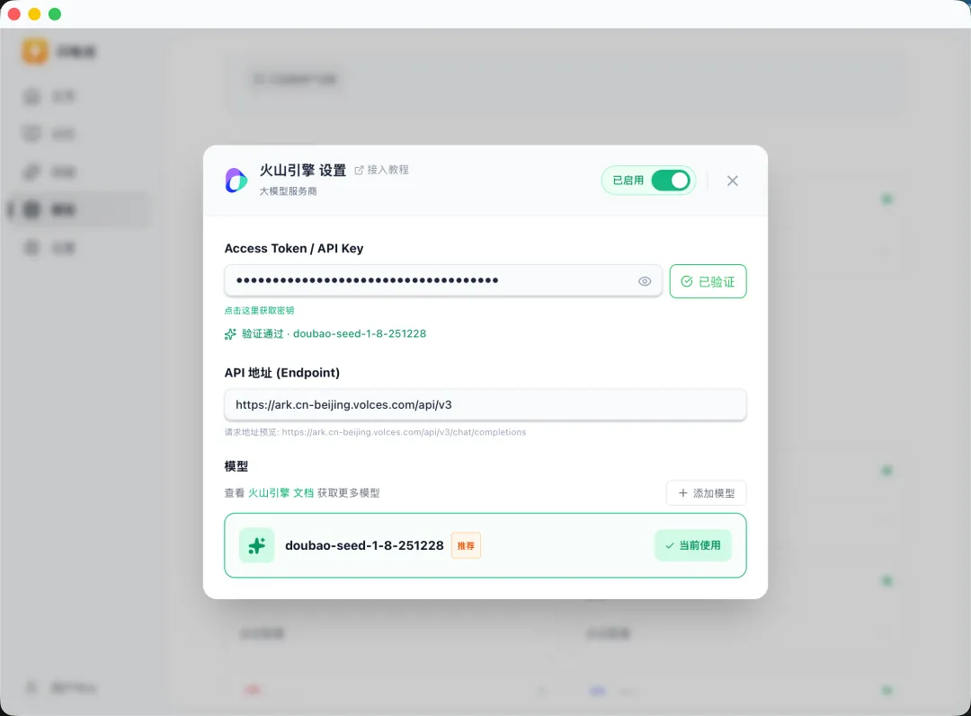- 最后我们回到模型界面检查一下,首先是语音识别模型已经更换为了”豆包流式”。其次,下方”火山引擎”的供应商栏有一个绿色小点,说明它运转正常。