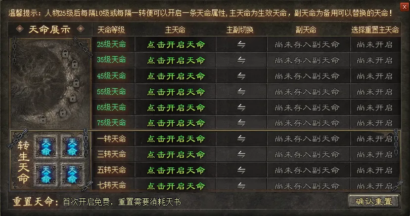 1:到达即可解锁,第一次免费,后续商铺购买天书即可洗练。所有天命属性、天命羁绊参考二大陆天命羁绊NPC(天命羁绊介绍)