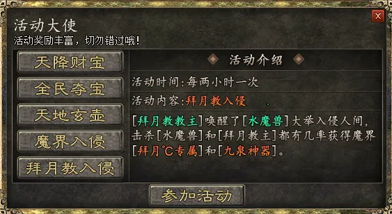 5:拜月教入侵(必参加)根据系统提示参加即可,产出邪神套,拜月专属,九泉神器!!!