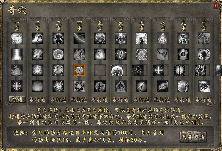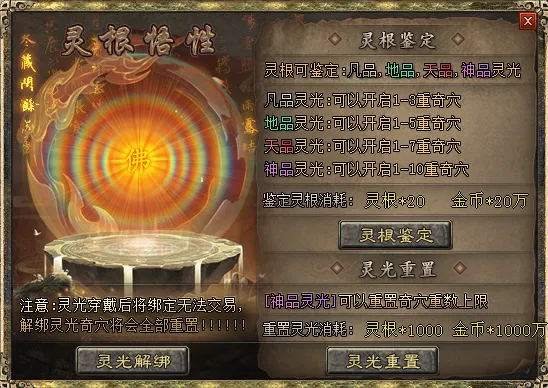 1:10个灵根随机抽取灵光(凡品~神品),运气好,一发入魂,抽取高级的可以开启1~10重奇穴。多余的灵光可以回收成太乙神针,打通奇穴,具体F10人物奇穴即可。