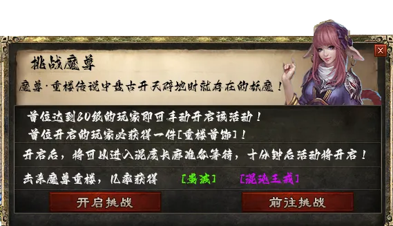 4:挑战魔尊:首位达到80级的玩家需手动点击开启挑战即可触发。(第一位开启挑战必获得重楼首饰一件,前中期神器 )疯狂升级吧!!!