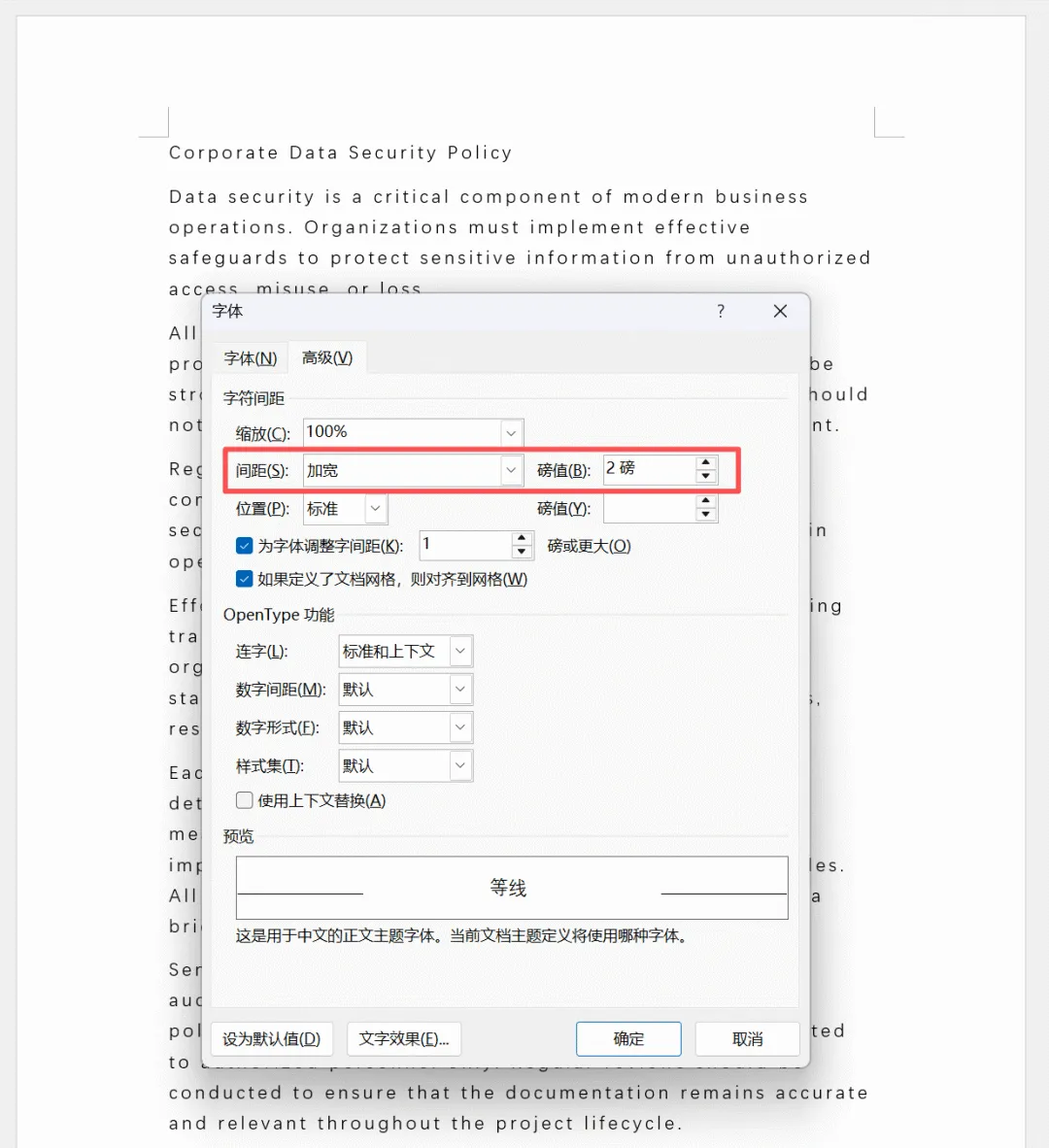 3、点击「字符间距」,根据自己的需求选择将字间距调整为标准、加宽或紧缩,并设置具体数值。比如这里我们以字符间距加宽2磅为例。