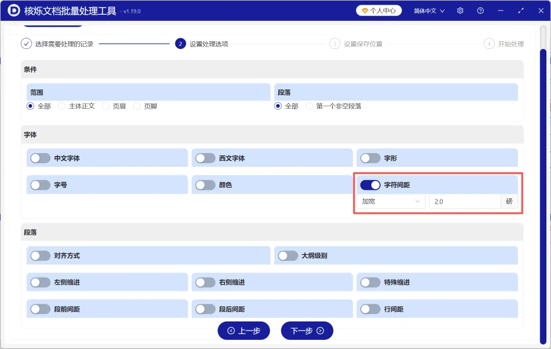 2、历史文档字间距杂乱,需要批量统一为标准/加宽/紧缩,适配新模板或打印要求。