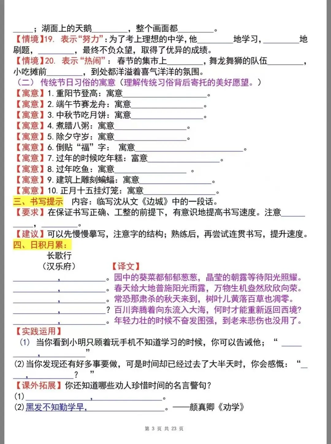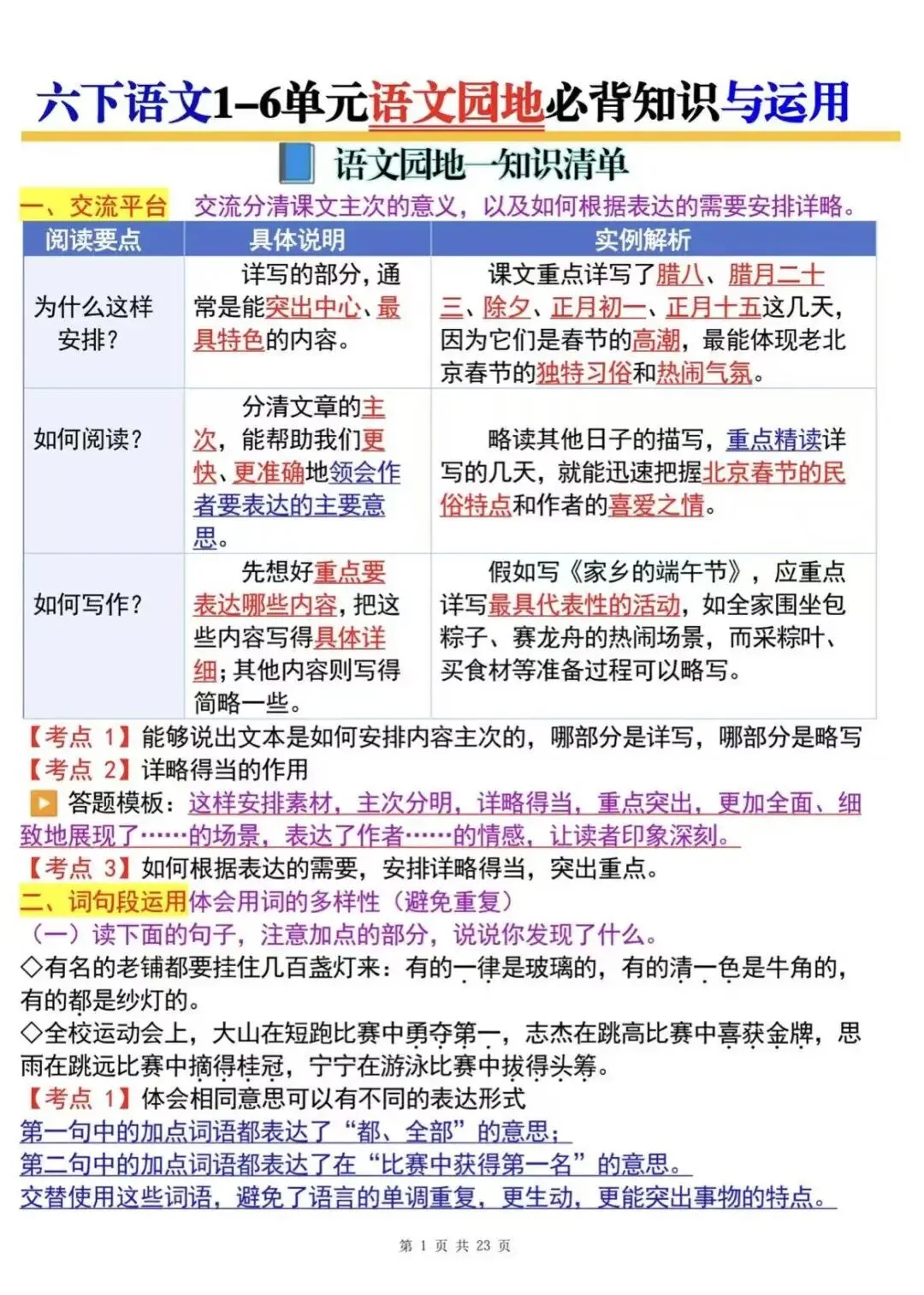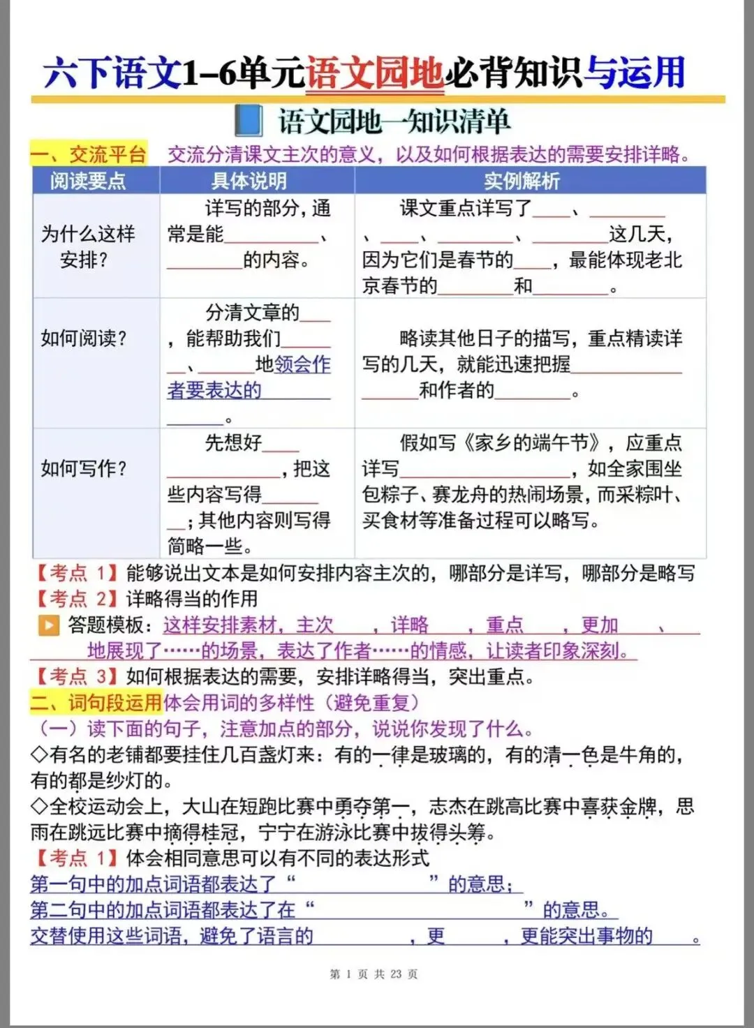 26春最新版六年级下册语文语文园地/日积月累/词句段运用《常考点知识速记+单元必背知识点》空白版可练习,有答案,高清可打印
