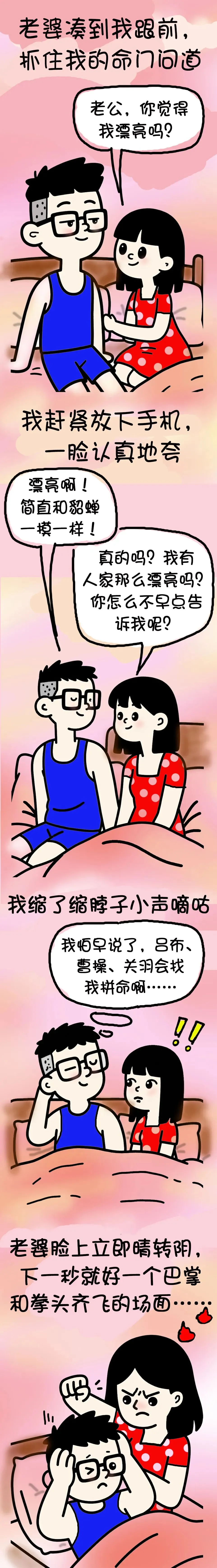 趣味漫画:老婆问我她美不美,夸老婆像貂蝉还不够,本想走甜蜜路线,结果嘴比脑子快,一句话让老婆从甜变狠,笑到我肚子疼! 猜 字 谜 1.江边点起两盏灯 2.依山傍水 3.门里阳光照,门外雨飘飘 把您的答案分享到评论区吧