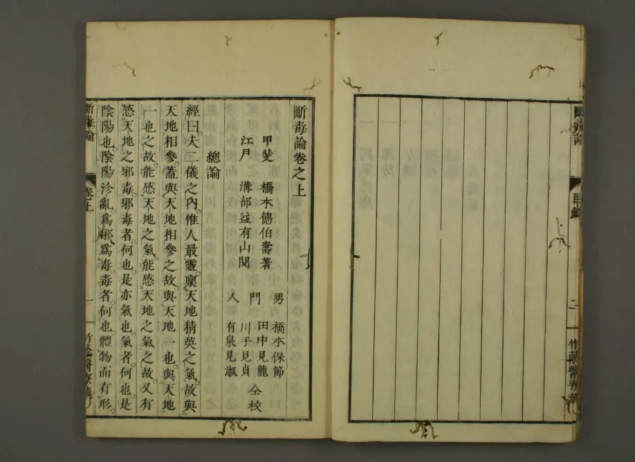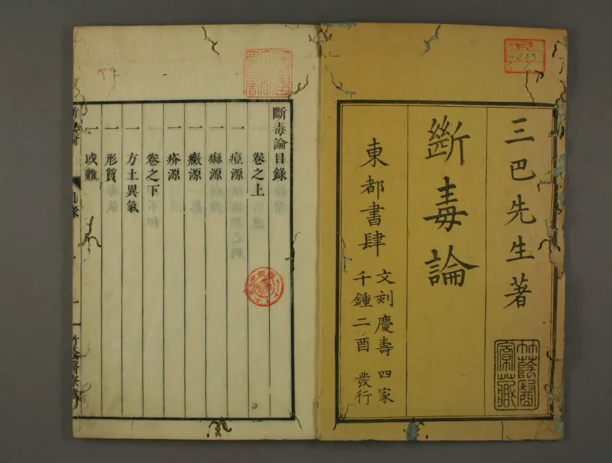《断毒论》为清代医家梅江瘖瘖子编撰的中医外科专著,全书分上下两卷,成书年代不详,主要聚焦外科痈疽疮疡及各类毒症的辨证治疗。上卷详述痈疽病因、阴阳辨证、脉法及顺逆预后,强调“断毒”核心理念,收录内服方剂百余首,涵盖清热解毒、消肿排脓等治法;下卷专论外治技法,包括敷贴、灸法、针砭及膏药制作,载有外科验案与急救解毒方,如“解百毒方”“断疔方”等,理论体系融合《内经》与历代外科经验,尤重“毒”之病机分析与内外兼治原则。该书作为清代民间外科诊疗的重要文献,保存了独特的解毒疗法与方药经验,对研究中医外科“毒症”理论及临床实践具有重要价值,现藏于中国中医科学院图书馆,是中医外科与解毒医学研究的珍贵资料。