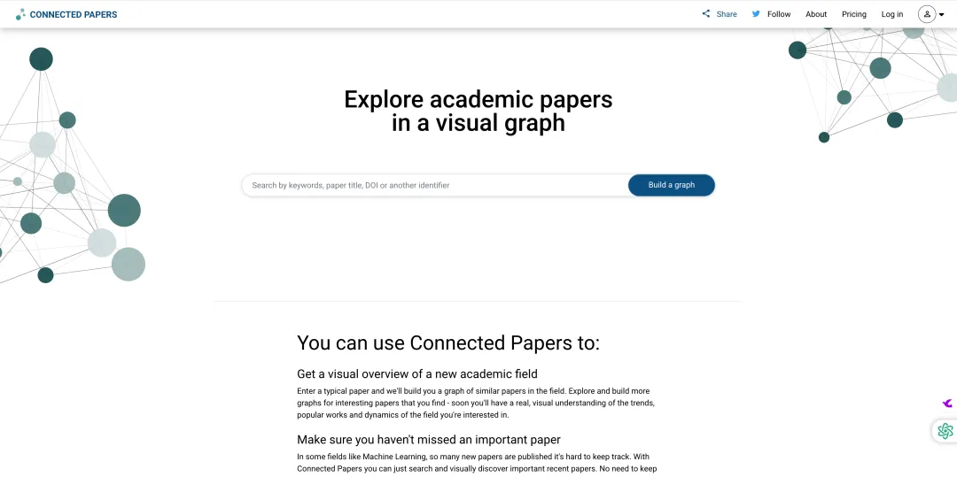 它能做什么:输入一篇论文(DOI、标题或 PMID),自动生成一张可视化文献图谱,展示这个领域的发展脉络和关键节点。