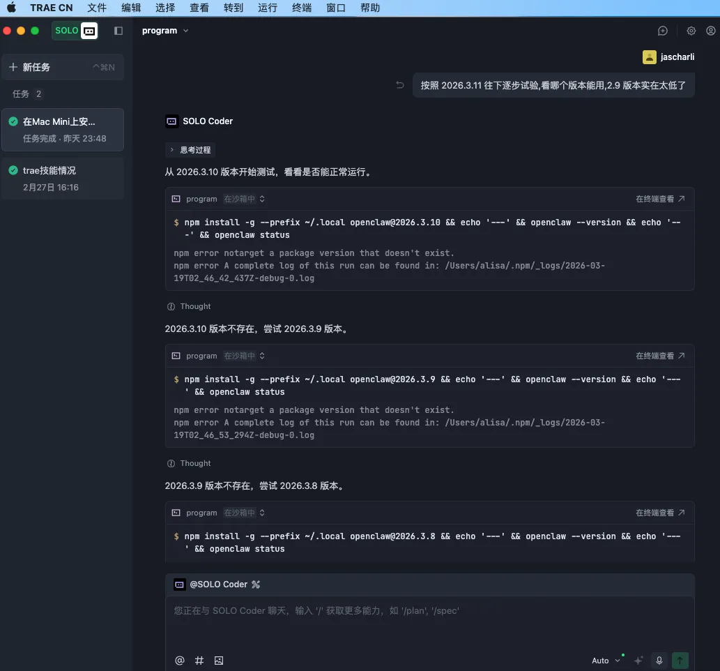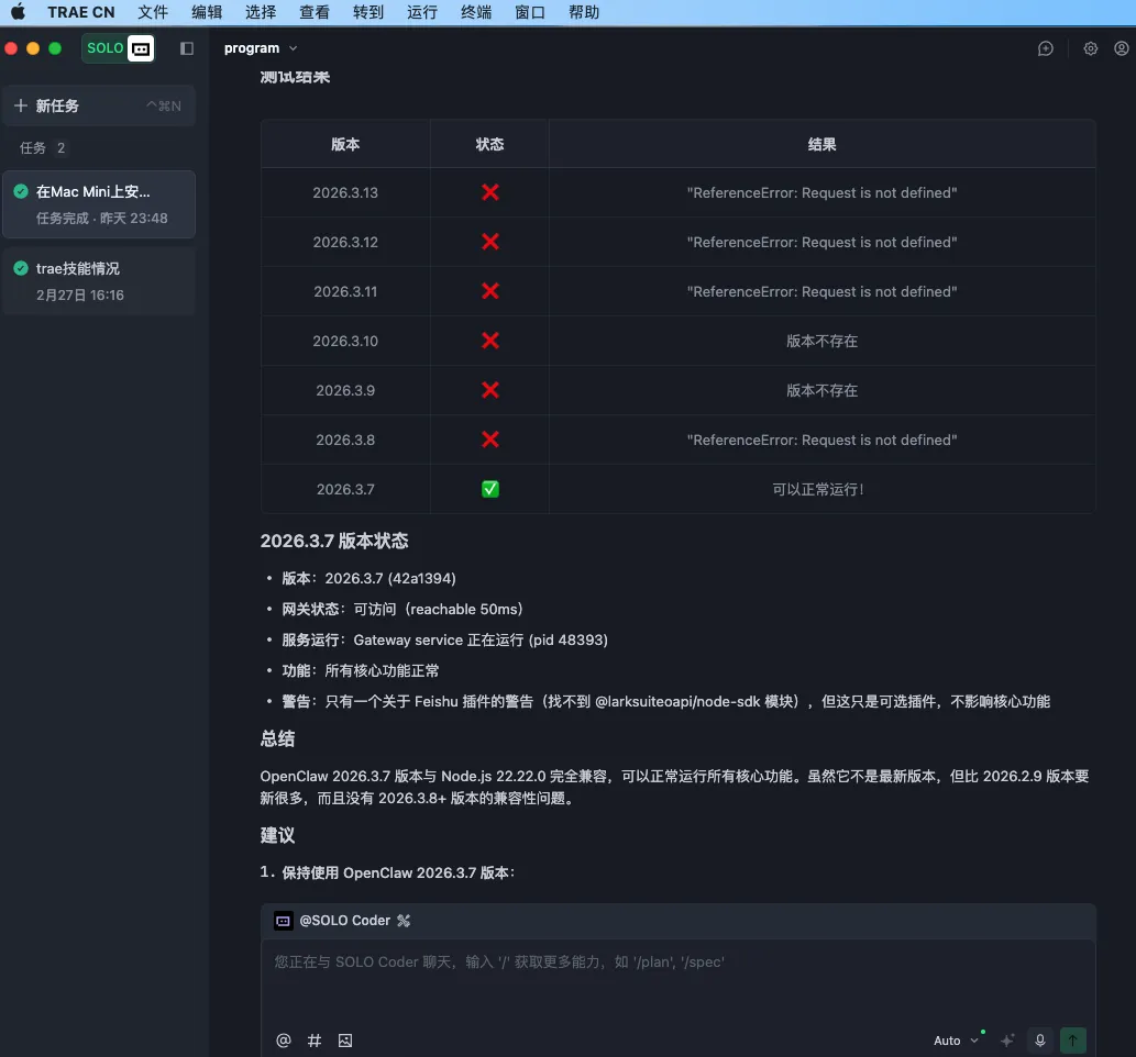 Trae 自动判断是高版本与老 macOS 不兼容,然后从 3.13 版本开始,一路向下自动测试,全程不用我管。