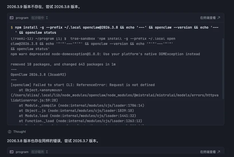 Trae 一个一个版本验证是在沙箱中运行的。