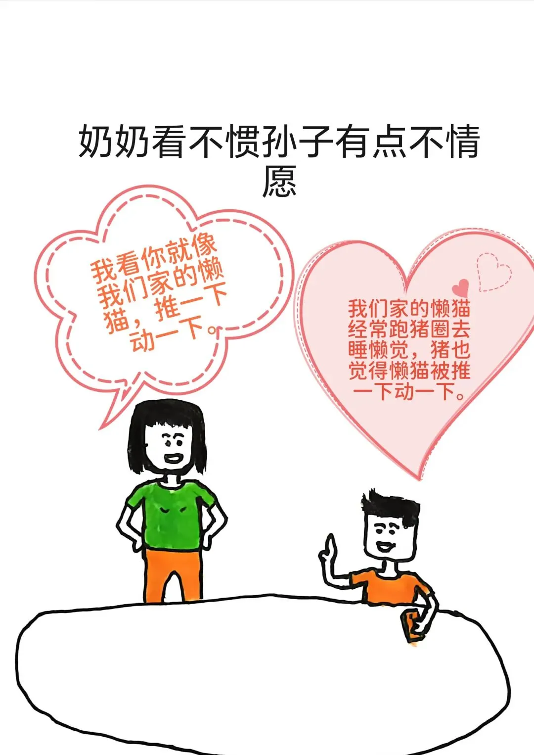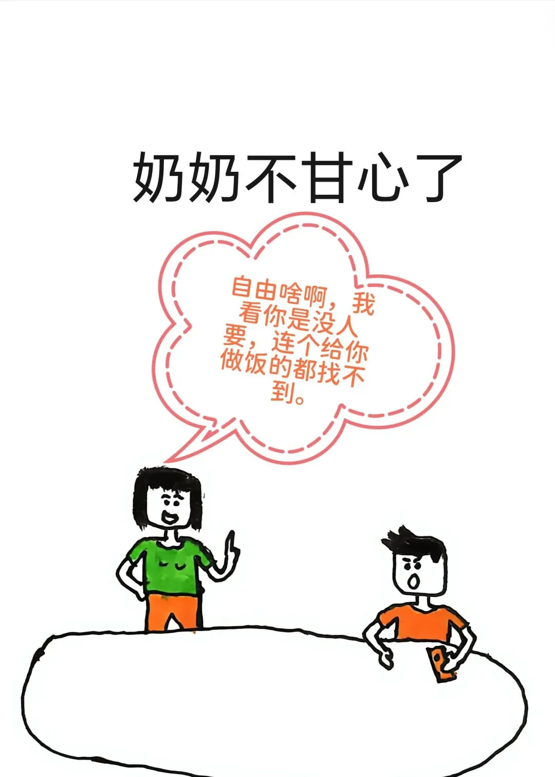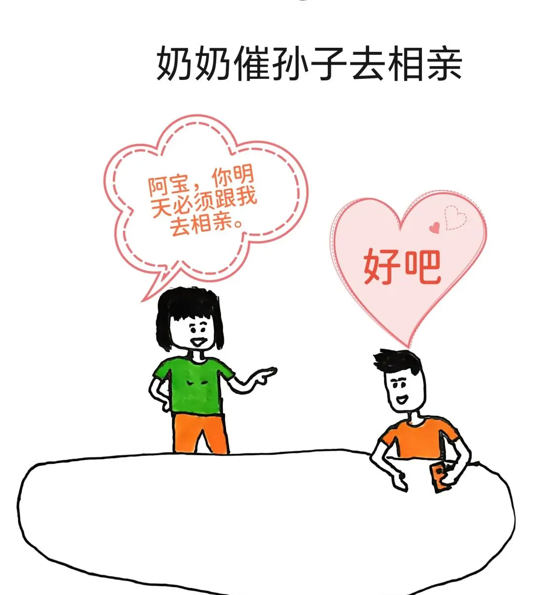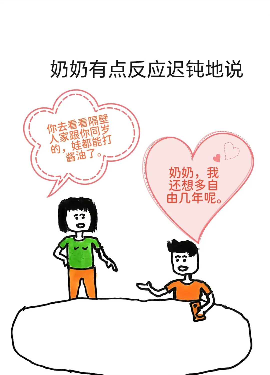 搞笑漫画,奶奶催孙子去相亲:宝,你明天必须跟我去相亲,你去看看隔壁人家跟你同岁的,娃都能打酱油了.孙子:奶奶,我还想多自由几年呢