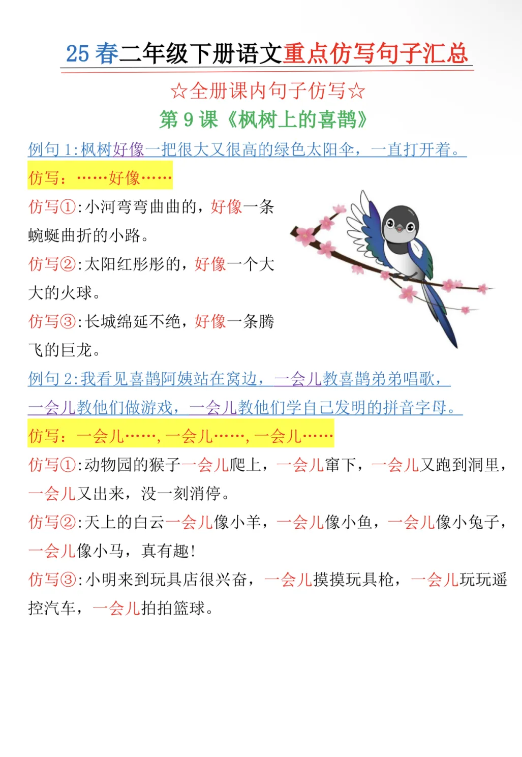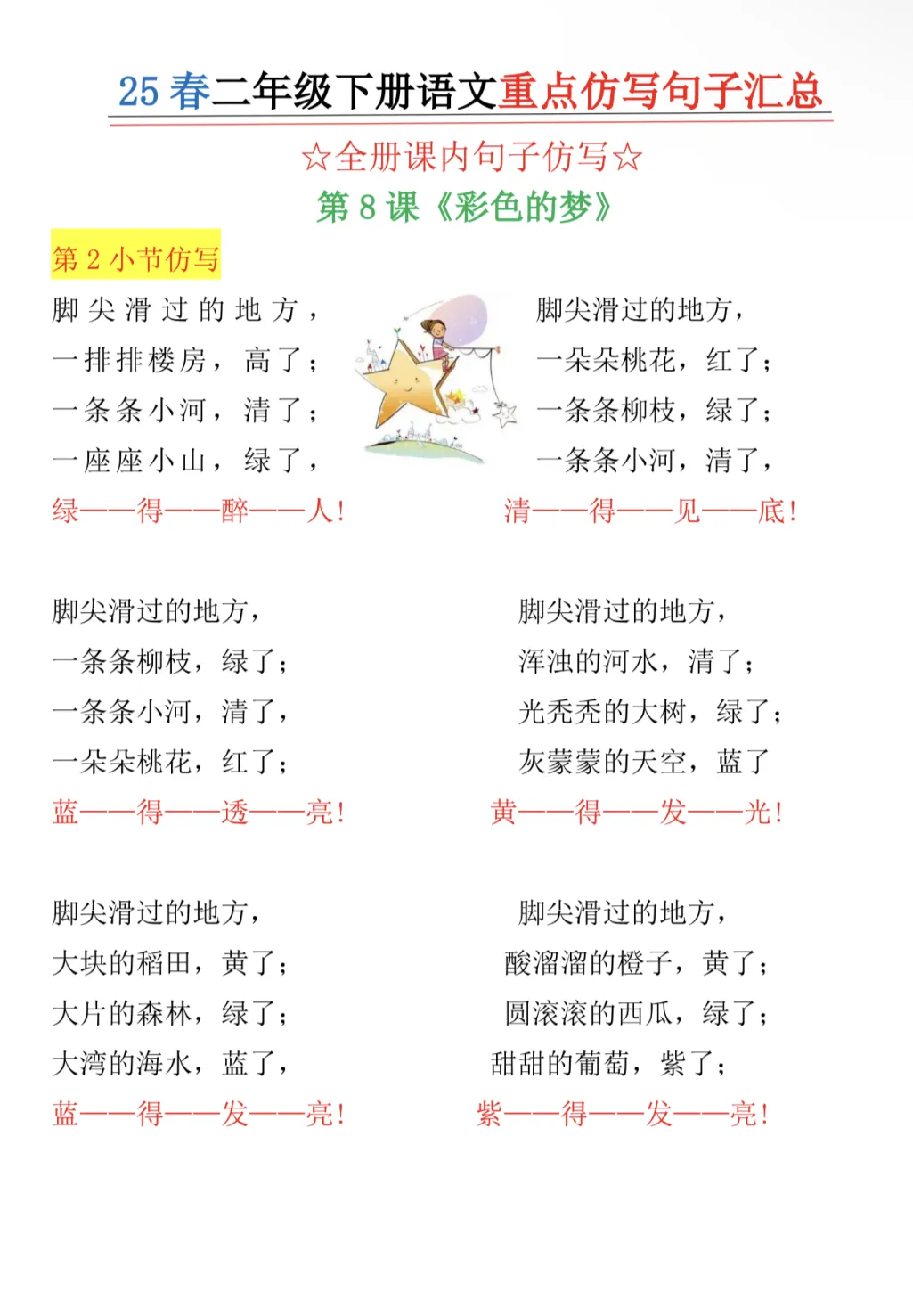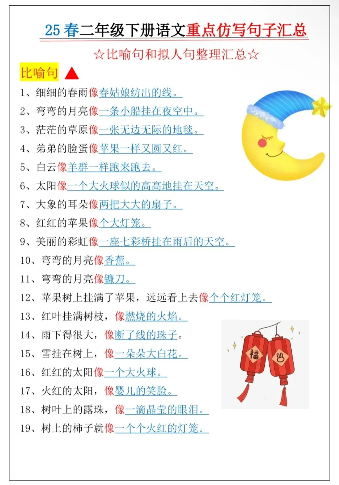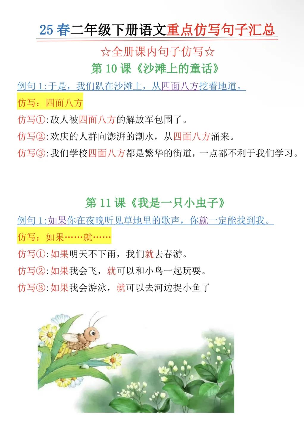 今天为大家分享二年级下册语文【重点仿写句子】,全是考试常考、课本📗里常见的句子类型,孩子多读多仿写,语感提升特别快~趁着现在多练几遍,写话就不怕没话说了!💪建议每天读两句,搭配画画或口头造句,效果更好哦!🎨