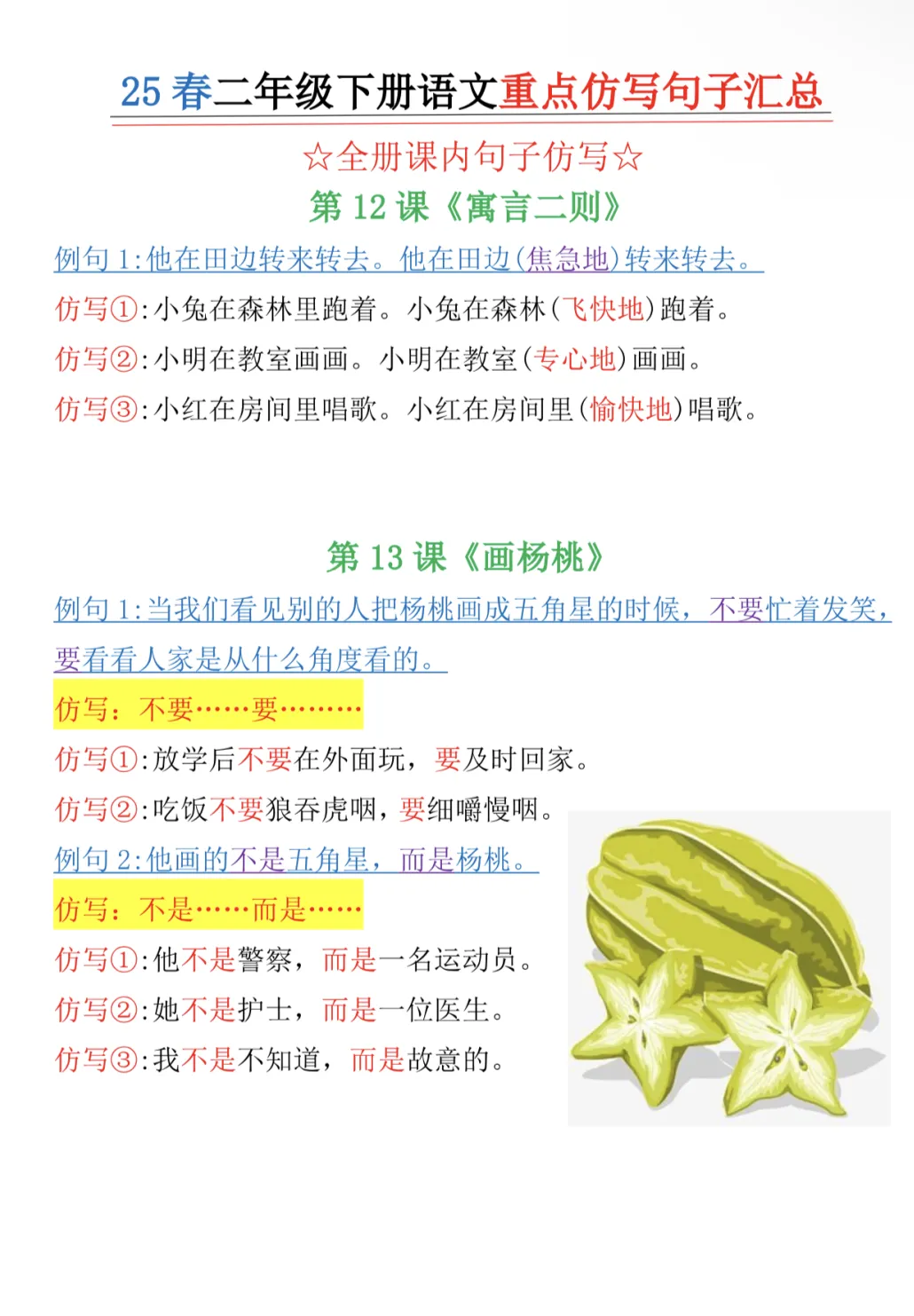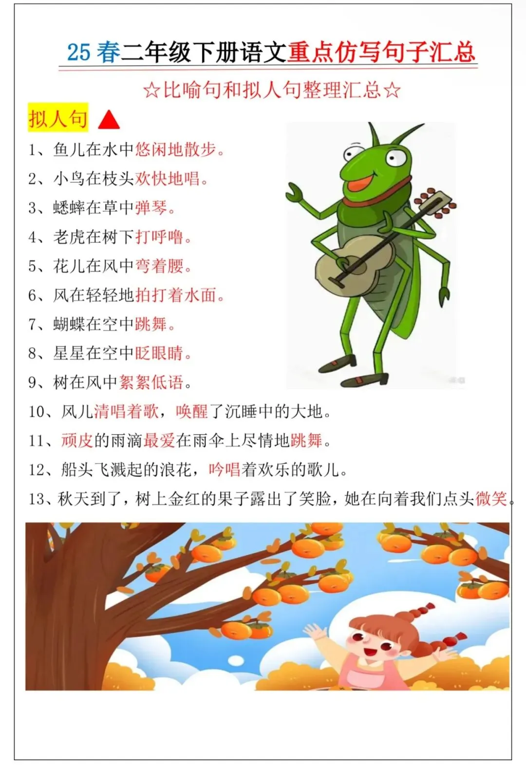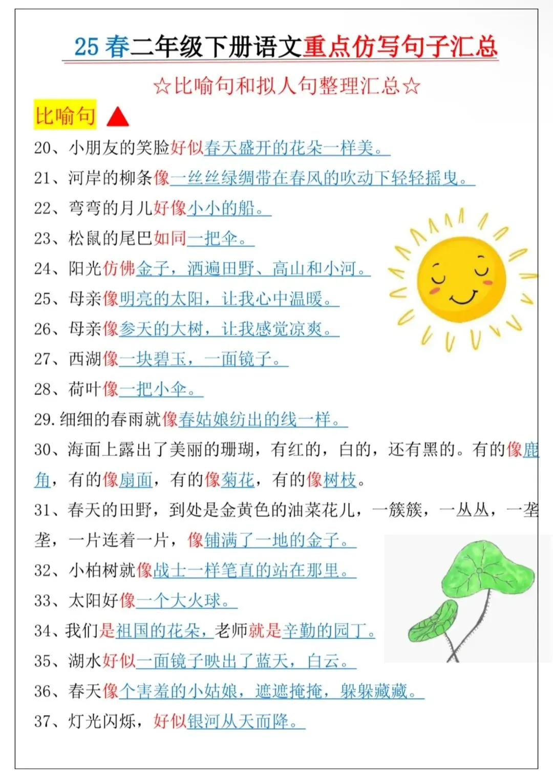 今天为大家分享二年级下册语文【重点仿写句子】,全是考试常考、课本📗里常见的句子类型,孩子多读多仿写,语感提升特别快~趁着现在多练几遍,写话就不怕没话说了!💪建议每天读两句,搭配画画或口头造句,效果更好哦!🎨