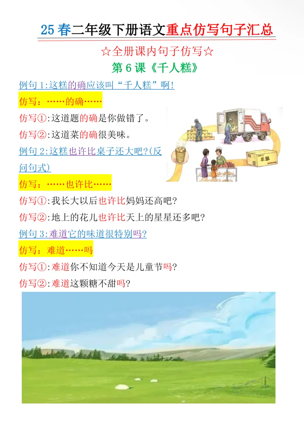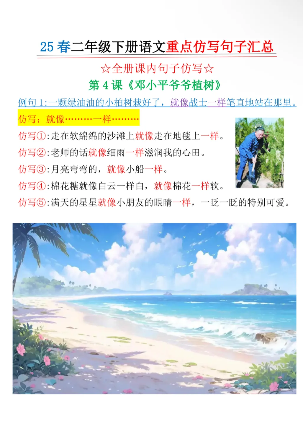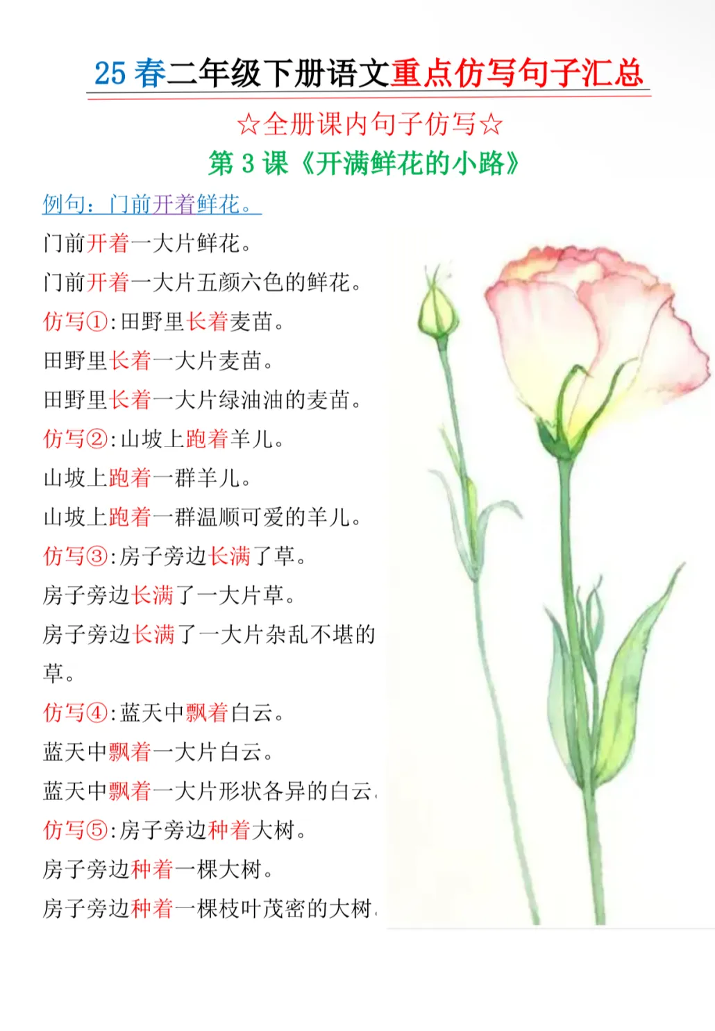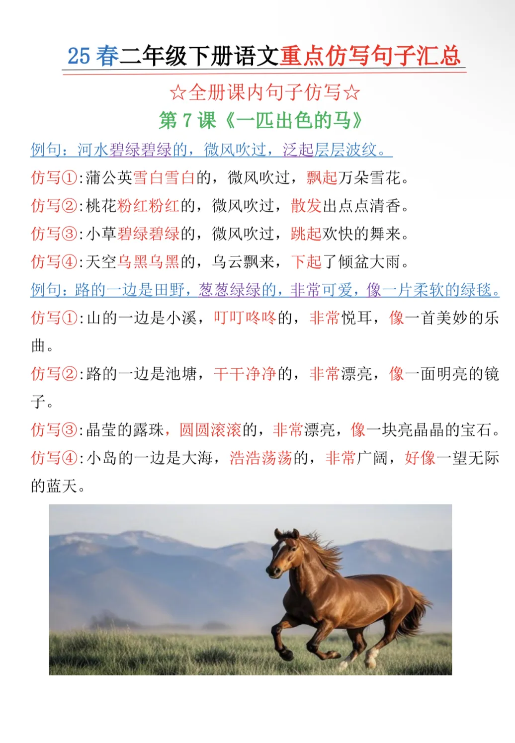 今天为大家分享二年级下册语文【重点仿写句子】,全是考试常考、课本📗里常见的句子类型,孩子多读多仿写,语感提升特别快~趁着现在多练几遍,写话就不怕没话说了!💪建议每天读两句,搭配画画或口头造句,效果更好哦!🎨