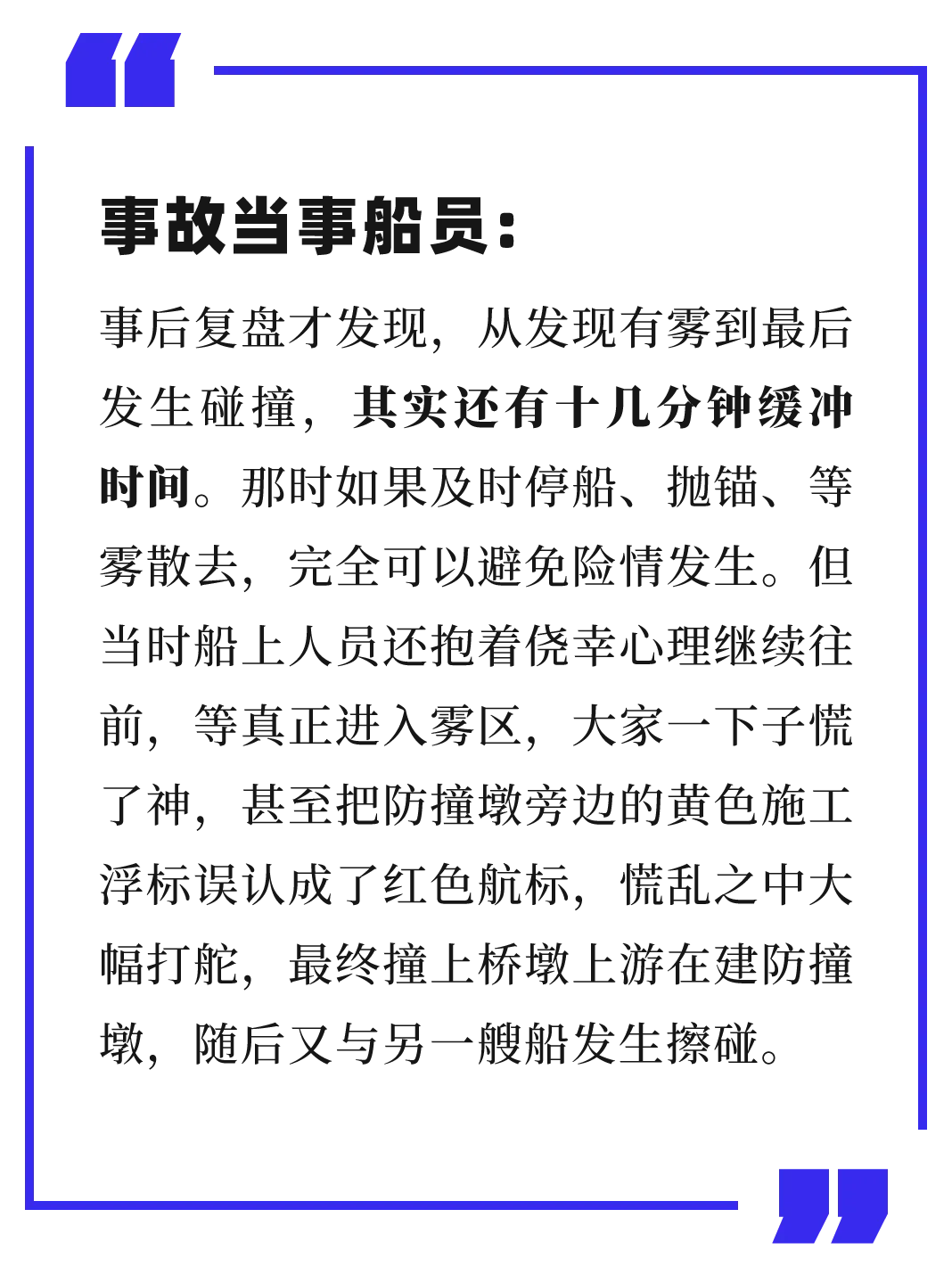2025年10月,船舶行经封开水域时突遇浓雾,在能见度不足500米的情况下,仍抱着侥幸心理继续前行,结果误认浮标、操作失误,撞上在建防撞墩,随后又与另一艘船发生擦碰。