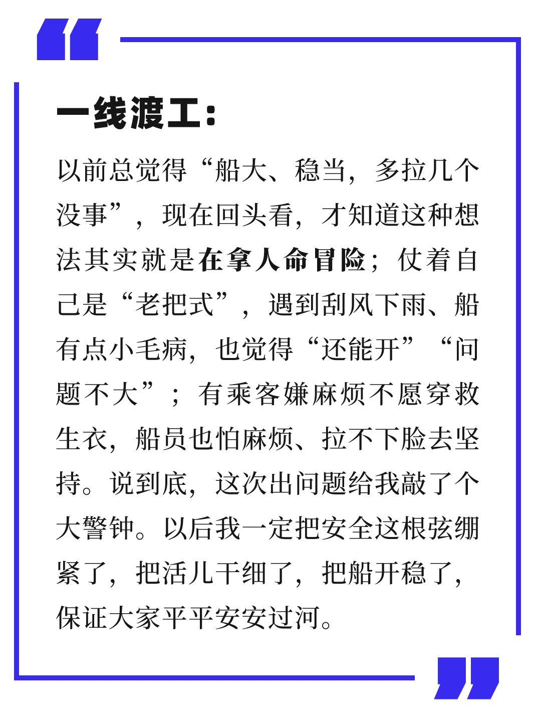 渡工代表立足涉客运营岗位,讲述渡口航行安全要点,警示涉客水域违规操作风险。