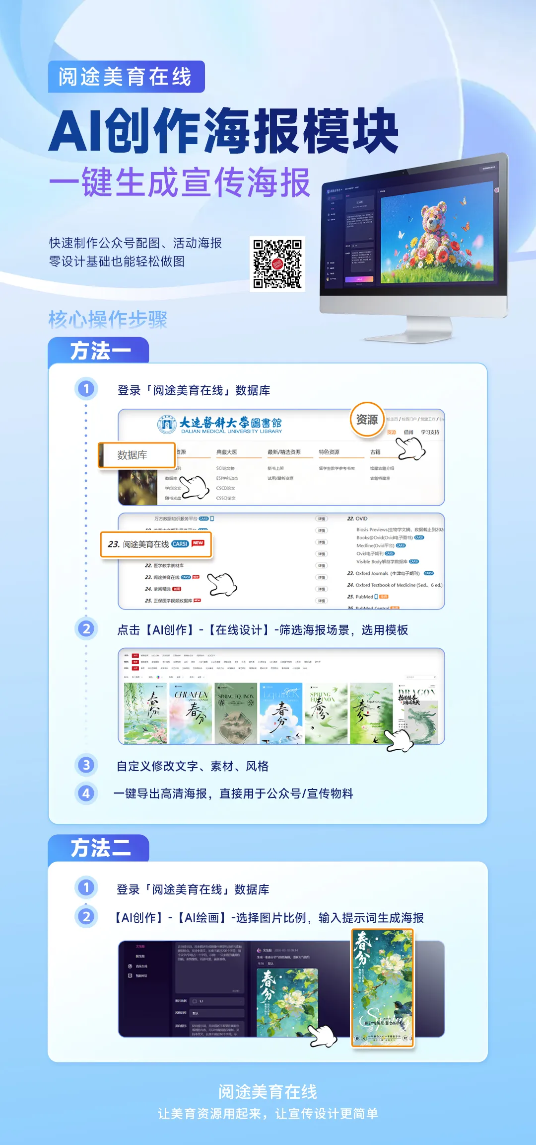 明天就要路演,今晚急需一张“百团大战”或班级团建的宣传海报。打开『阅途美育在线』,输入活动主题、风格关键词(比如“国潮”、“极简”、“医学风”),AI分分钟为你生成多款备选方案,从此告别深夜对着PS发愁。