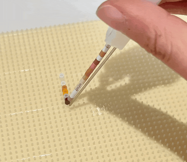 第一种最基础玩法,就是用镊子把豆子一颗颗按照网上的参考图夹到模板上,拼成想要的图案。
