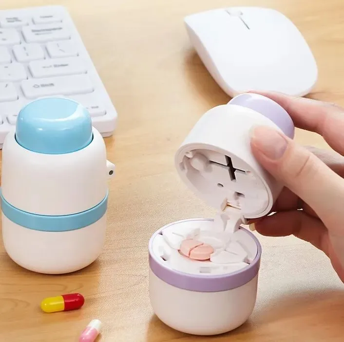 分药神器蓝色超亮眼!凡雅生活出品超靠谱。能一分二还能一分四。能装药,药片胶囊都行。隐藏刀片安全不伤手。合盖按顶就能清刀片。按压切药,开关有锁制。小小一个便携随身带。