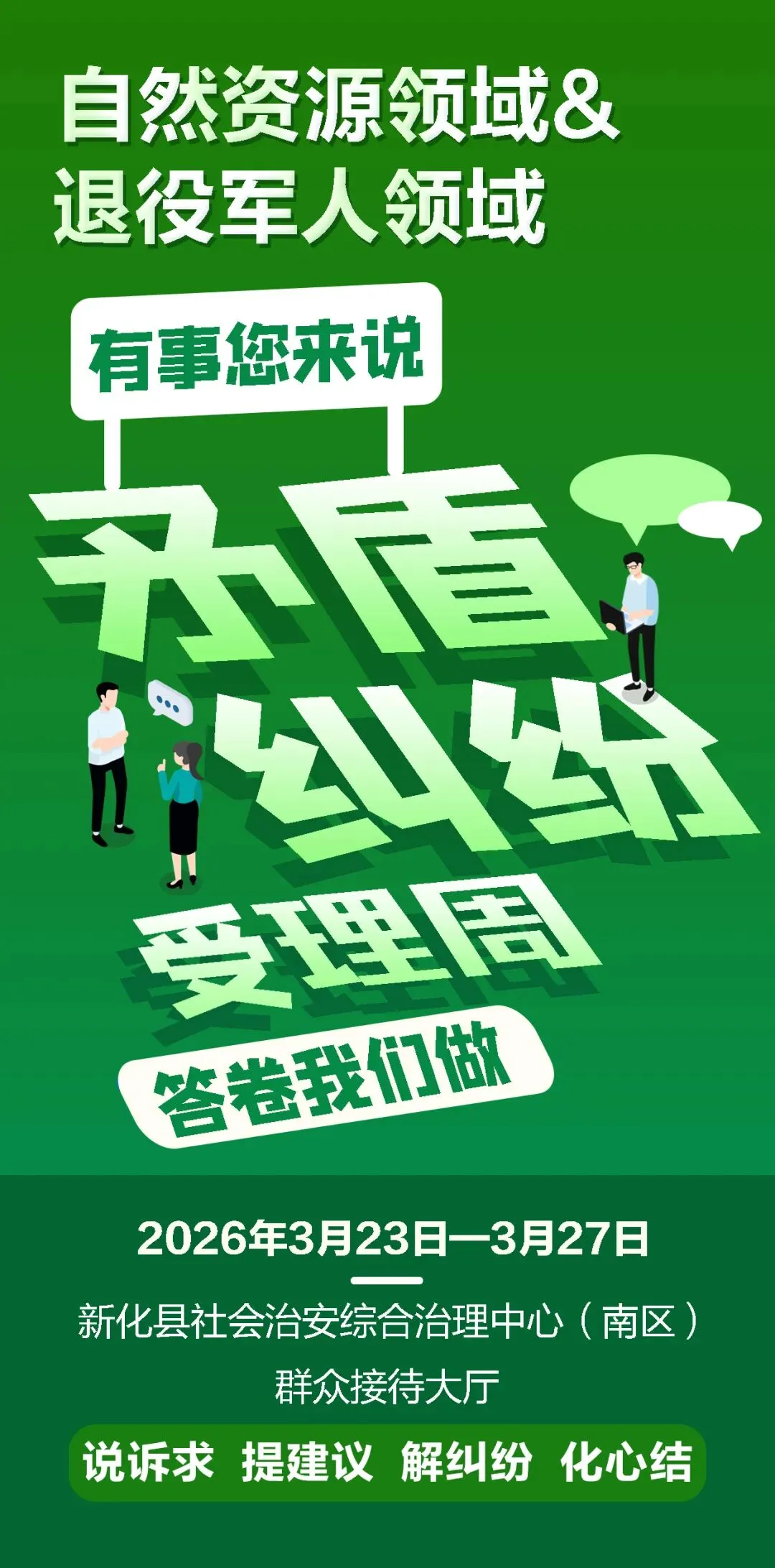 为创新推进综治中心规范化建设和实体化运行,方便群众反映诉求和政策咨询。根据新化县社会治安综合治理中心建立职能部门矛盾纠纷受理周制度,2026年3月23日—3月27日,由县自然资源局、县退役军人事务局受理本行业本领域矛盾纠纷和其他诉求事项。届时,欢迎广大群众来新化县社会治安综合治理中心(南区)群众接待大厅反映相关矛盾纠纷诉求、意见、建议和需要解决的问题。