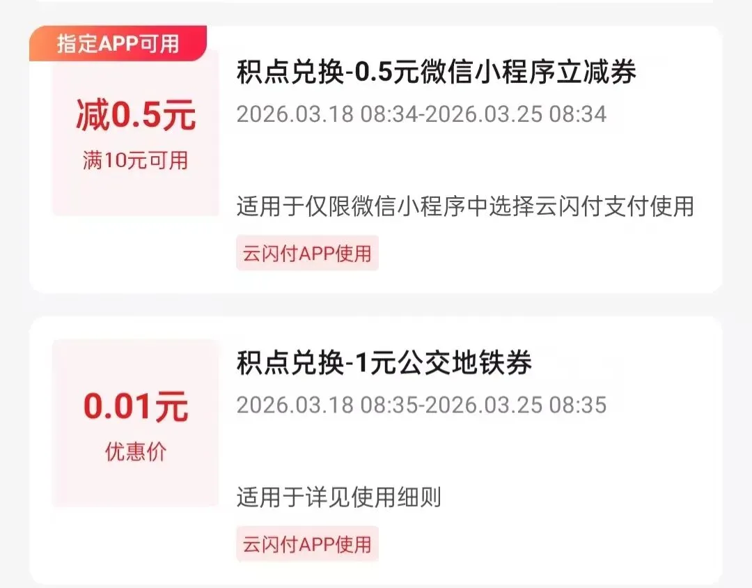六、云闪付积点兑换1元公交券+0.5元微信立减券!