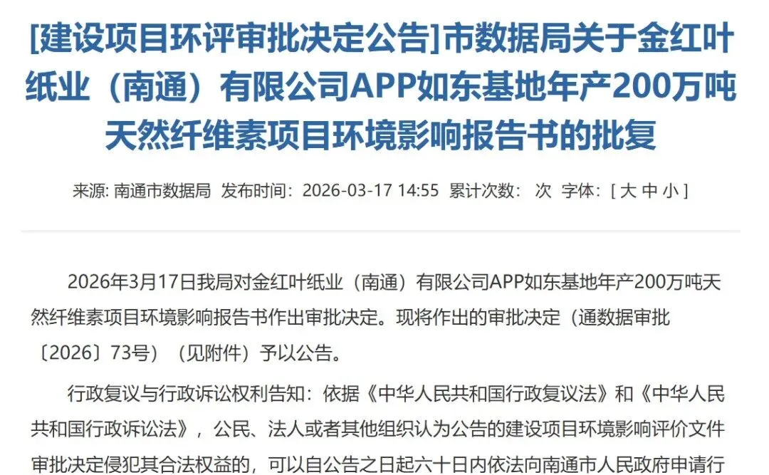 3月17日,南通市数据局发布了项目的批复公告,公告称:“根据项目环评结论,在公司严格落实《报告书》提出的各项生态环境保护措施及环境风险防范措施、各类污染物稳定达标排放且不突破控制总量的前提下,仅从环保角度分析,项目在拟建地址建设可行。”