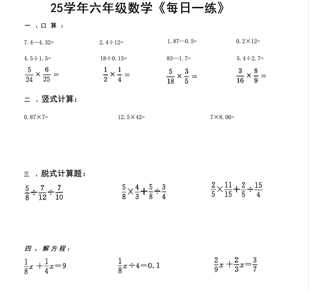 【上海初中】六年级计算、应用每日一练,可打印。