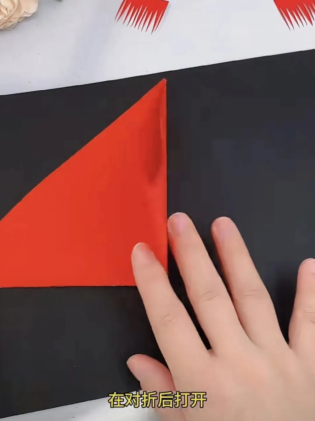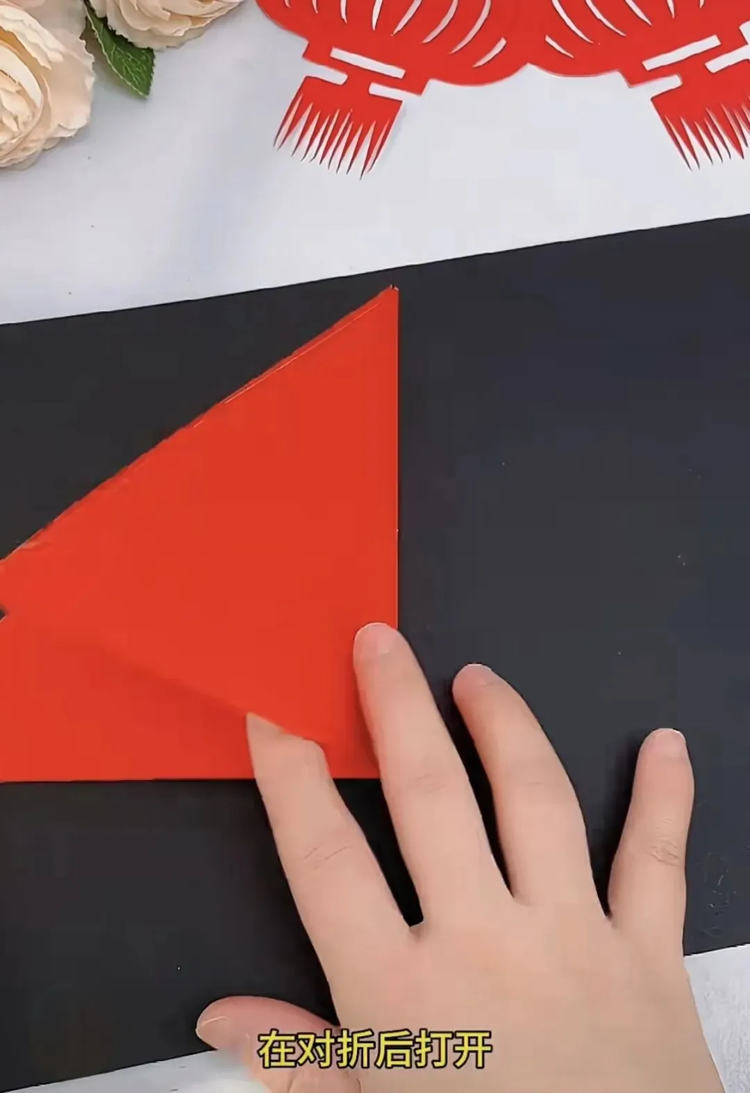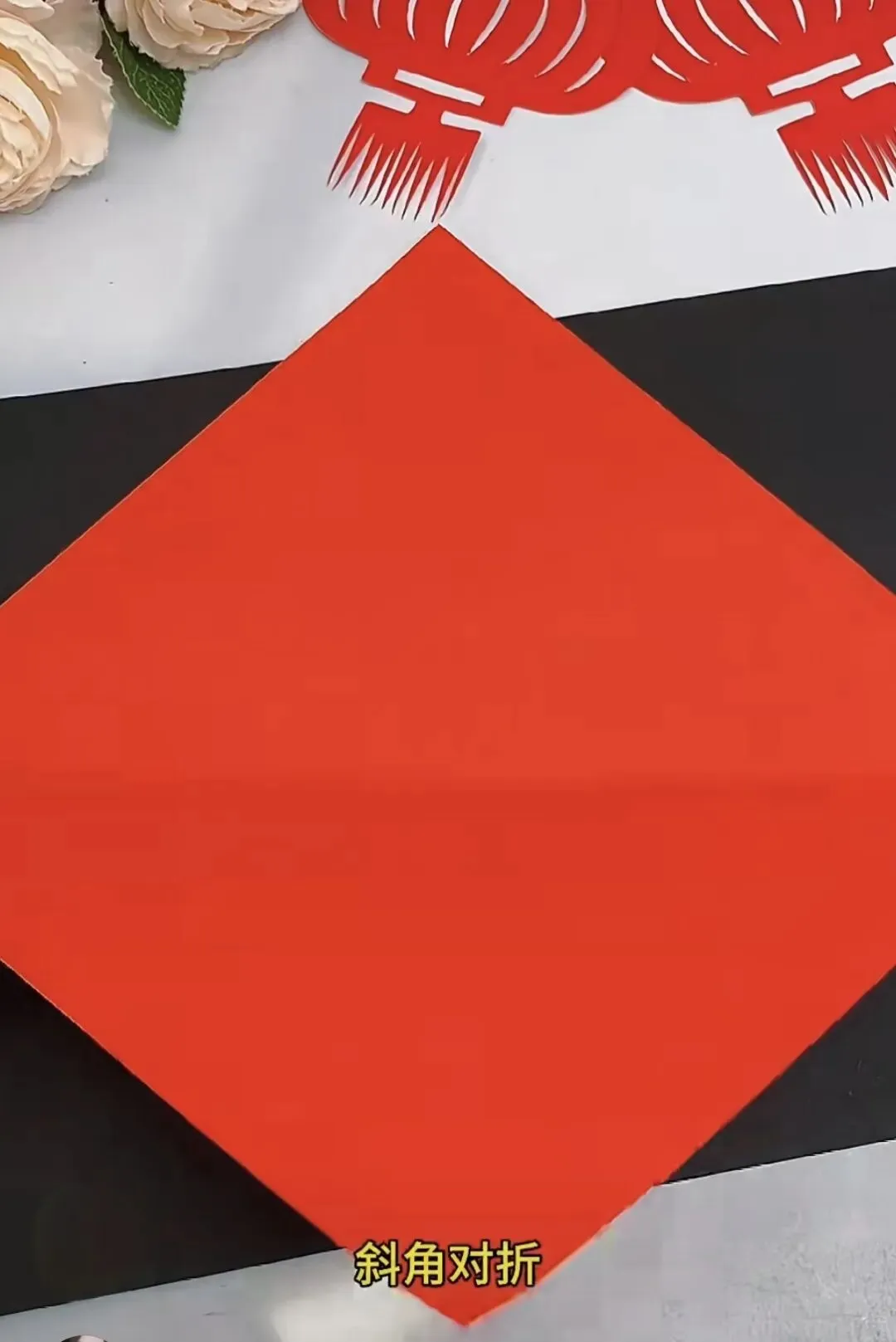 1. 折纸:将正方形红纸对边折叠一次,然后再对边折叠一次。