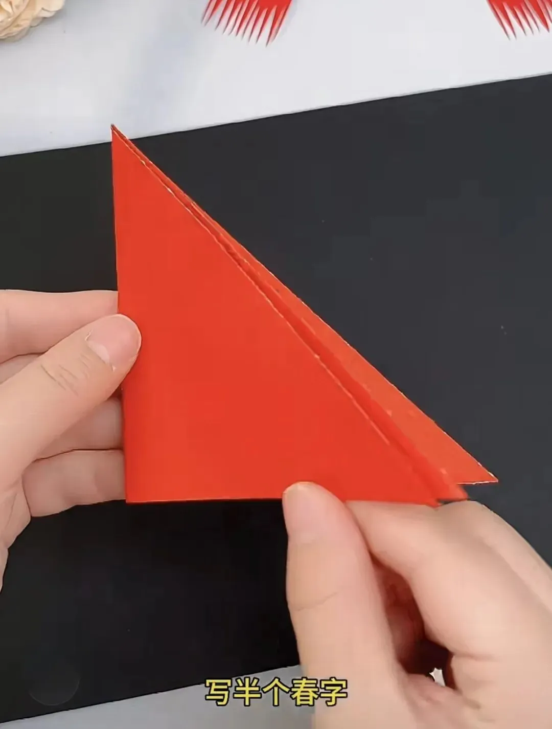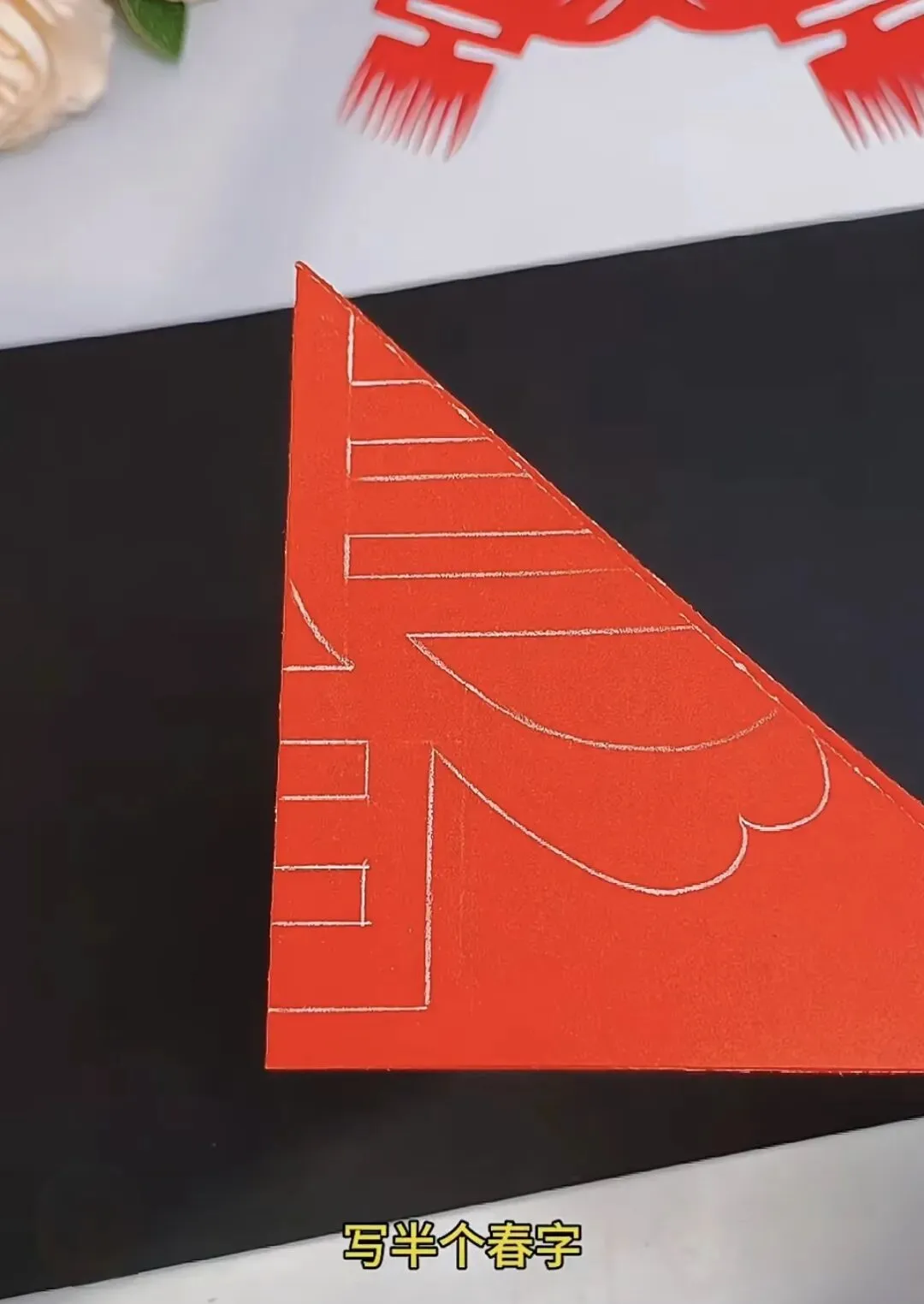 4. 画图:在折叠好的三角形纸上,按照“春”字的一半画出轮廓。