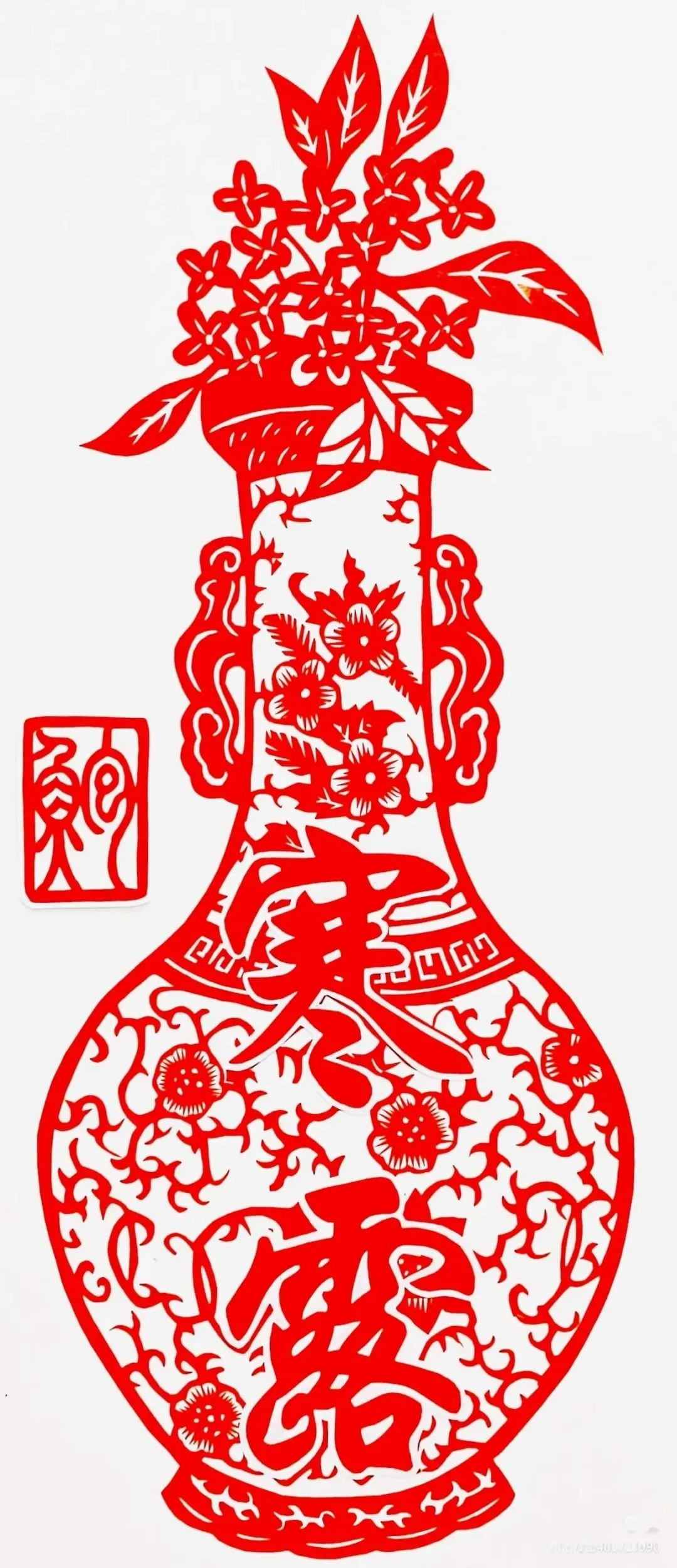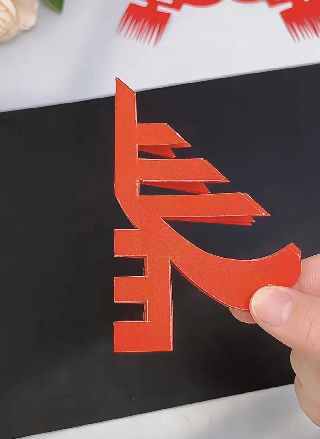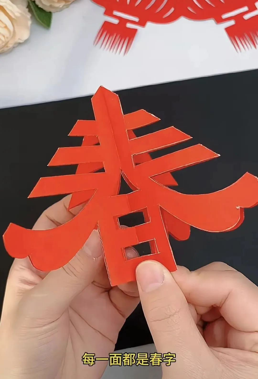 5. 剪刻:沿着画好的线条小心剪下,展开后就是一个立体的“春”字。