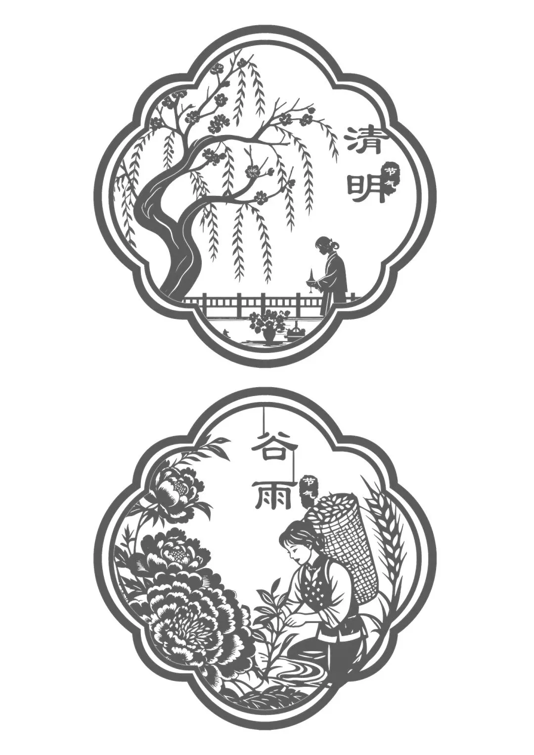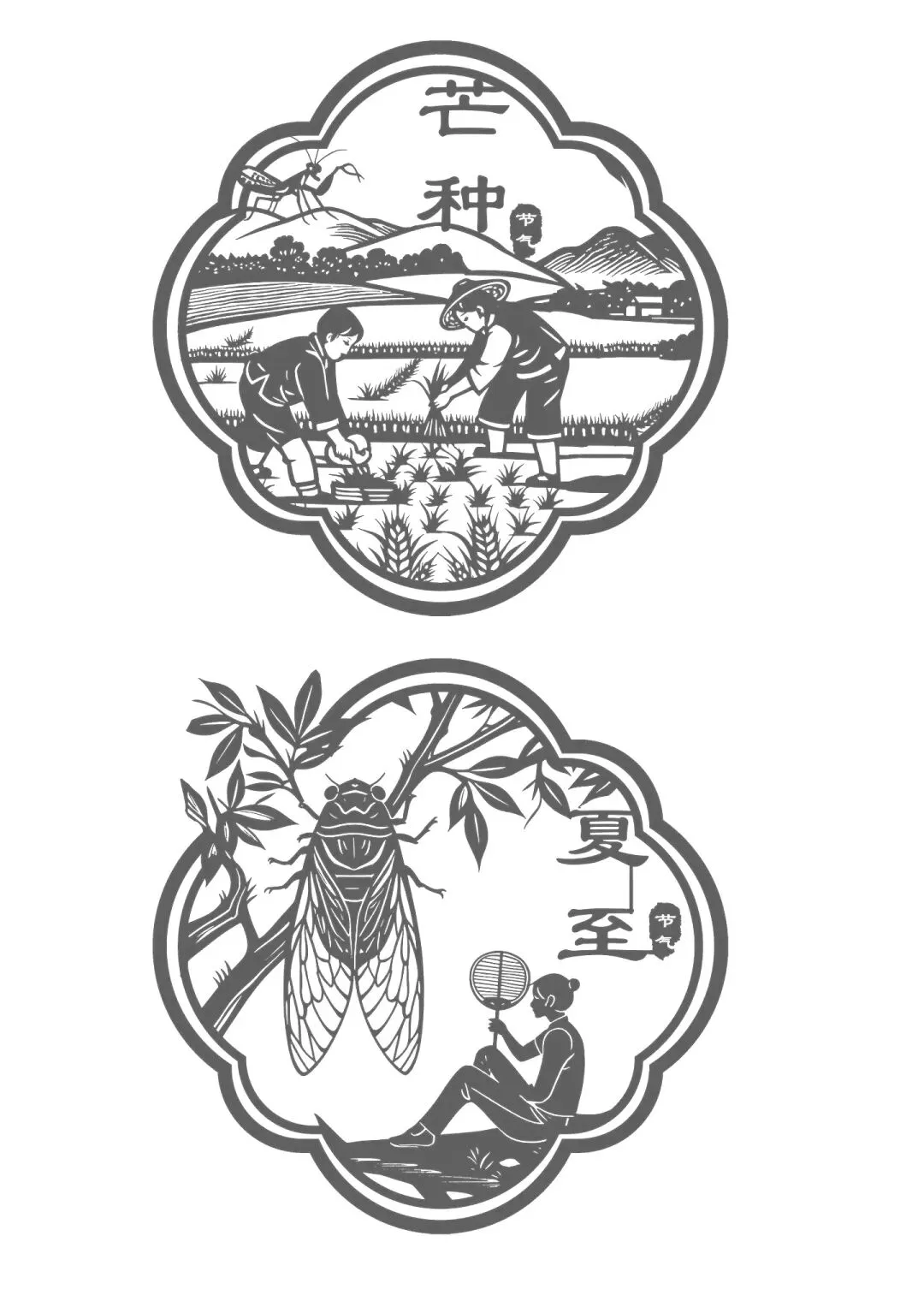 · 谷雨:剪谷粒饱满的麦穗、正在插秧的农夫。