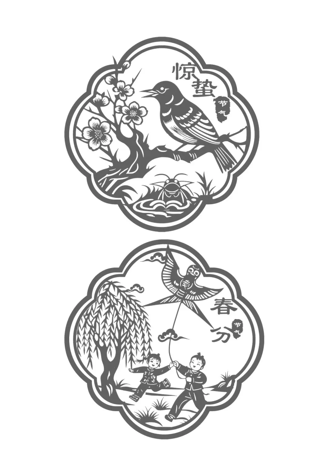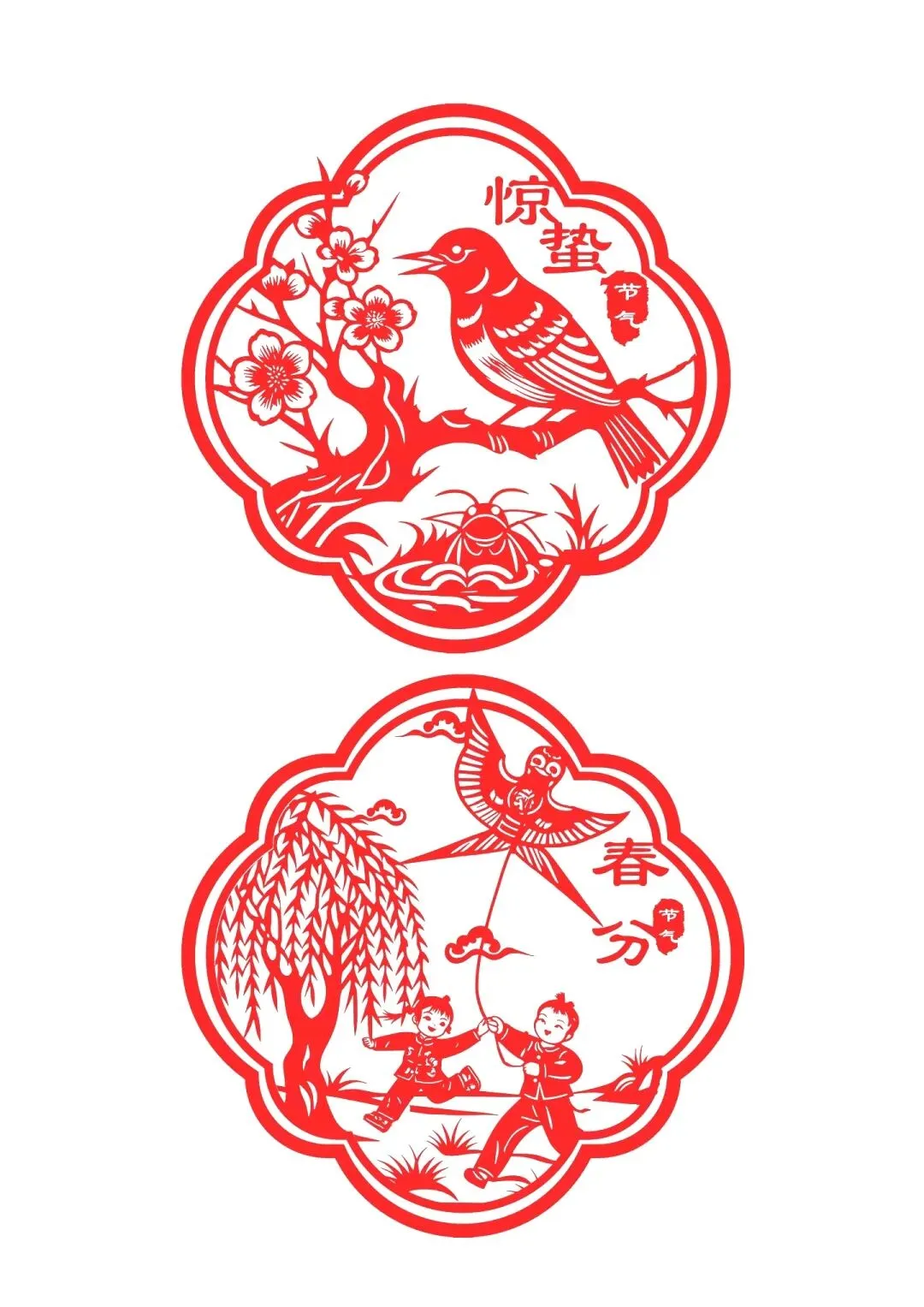 · 惊蛰:剪春雷纹样、苏醒的昆虫(如瓢虫、蝴蝶)。