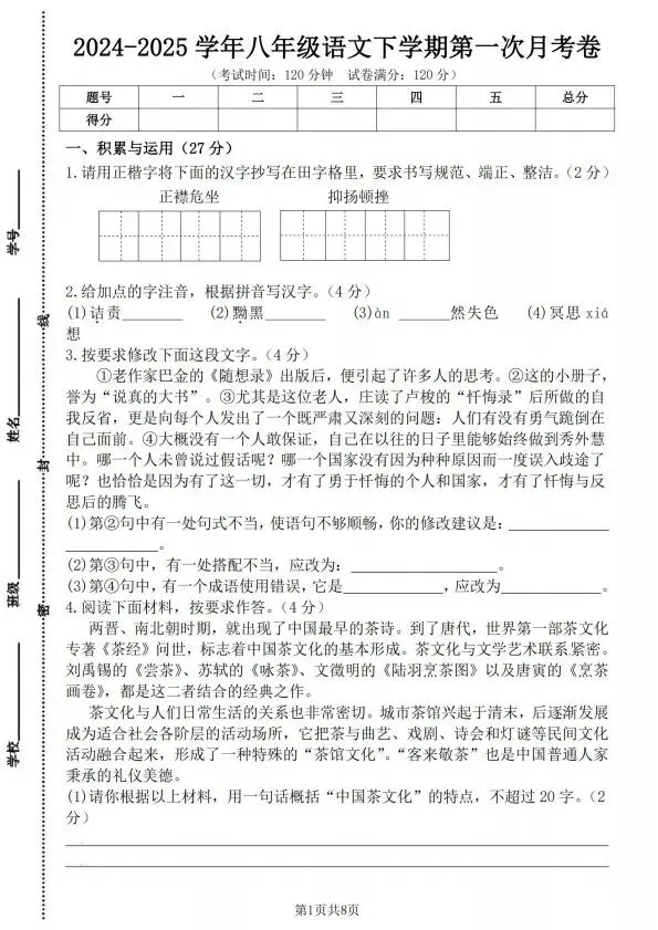 今日分享八年级下册语文第一次月考卷(含答案)完整电子版可打印!所有资料均为高清电子版,排版规整适配打印,不用费心整理,直接打印就能用。精准击破学习难点,帮孩子夯实基础、吃透考点,稳步提升学习效率!