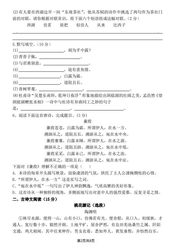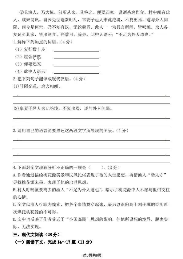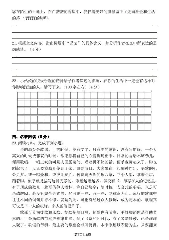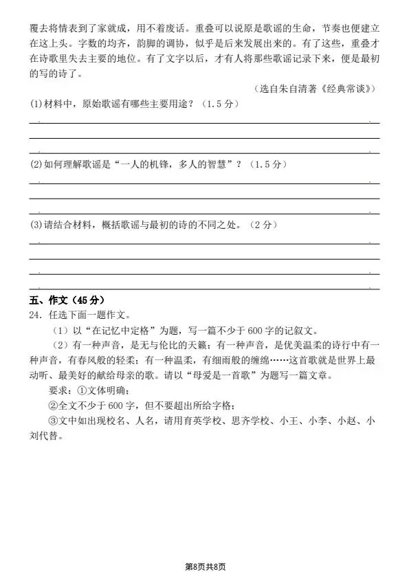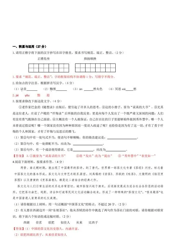 八年级下册语文第一次月考卷(含答案)完整电子版可打印