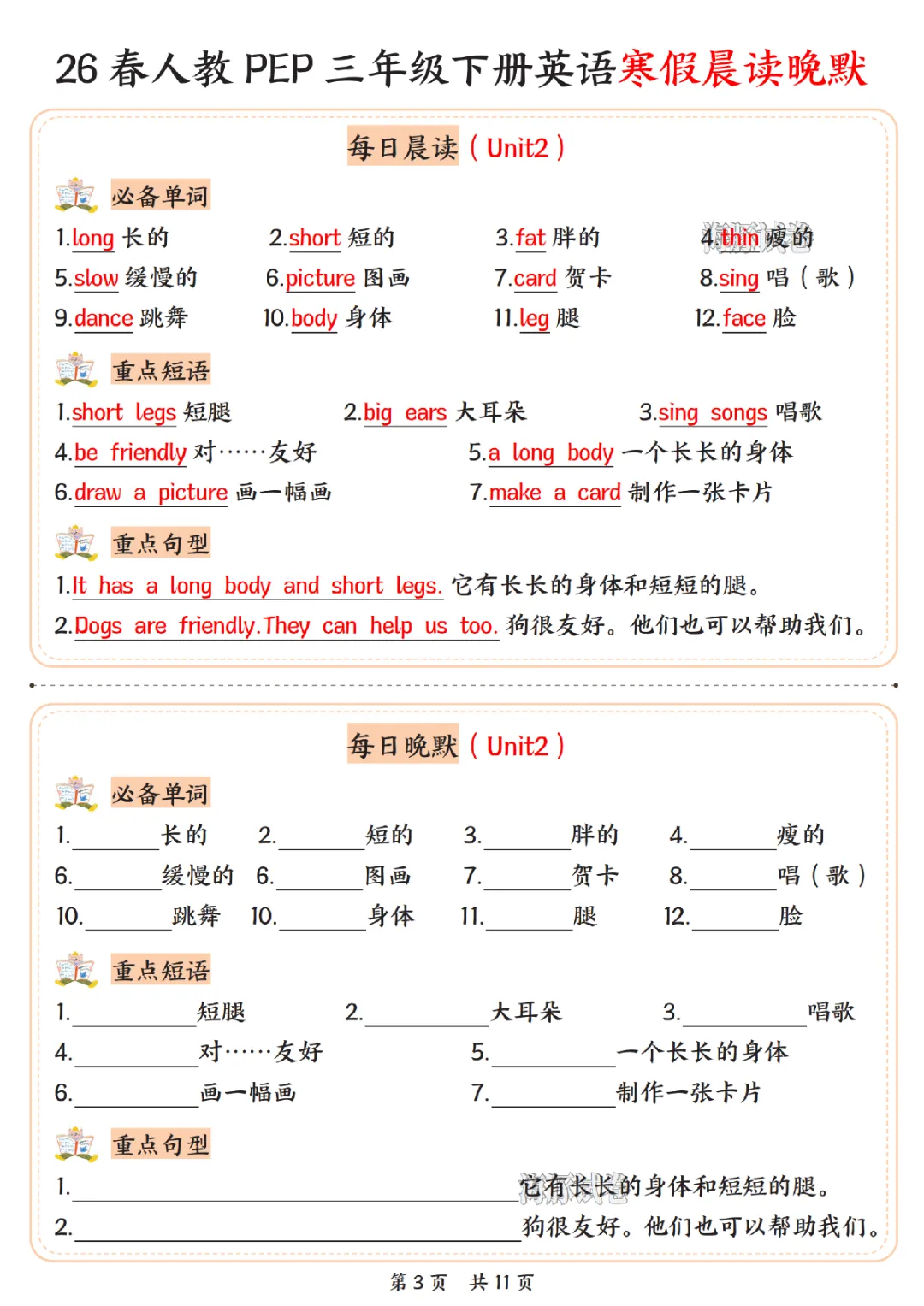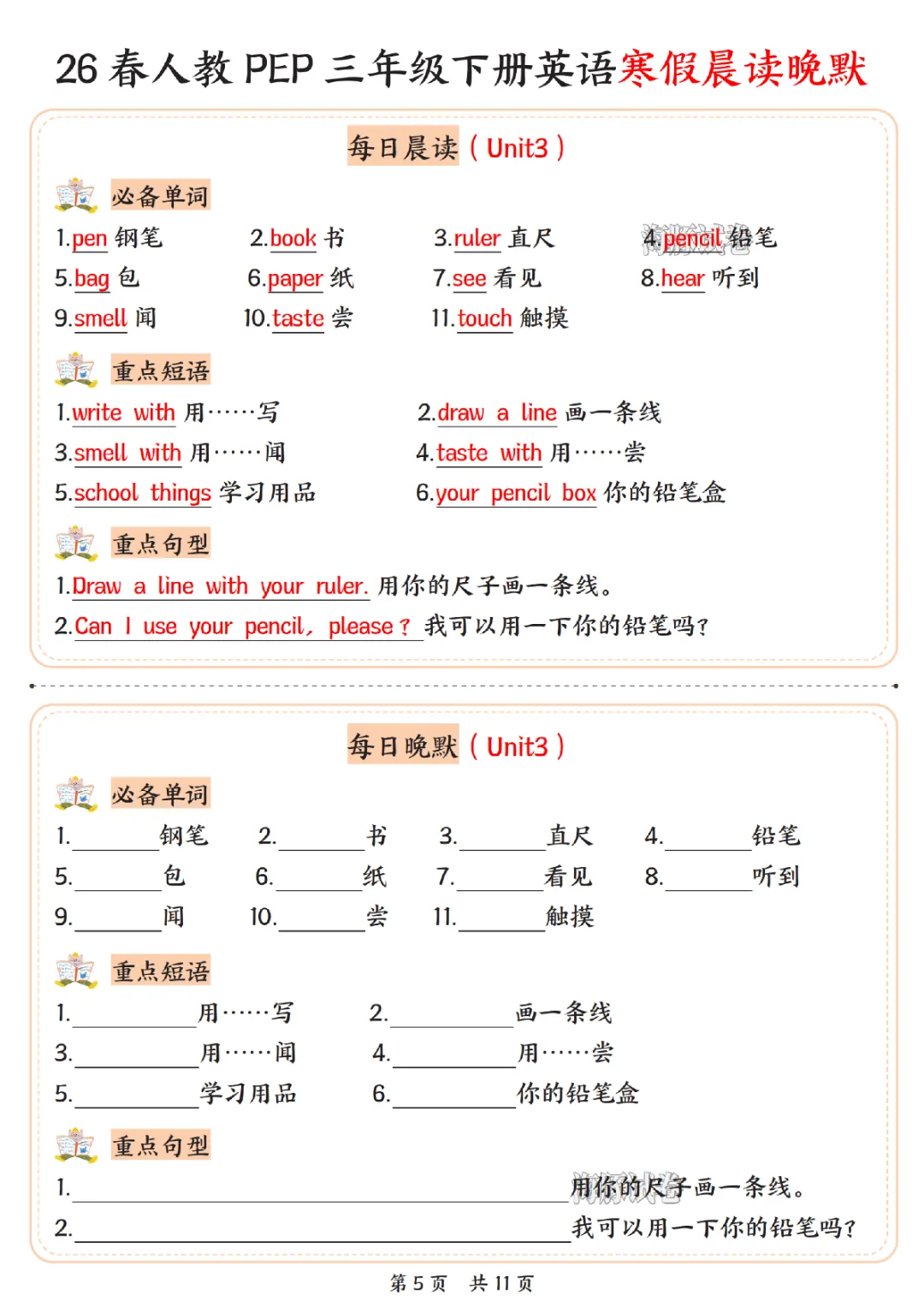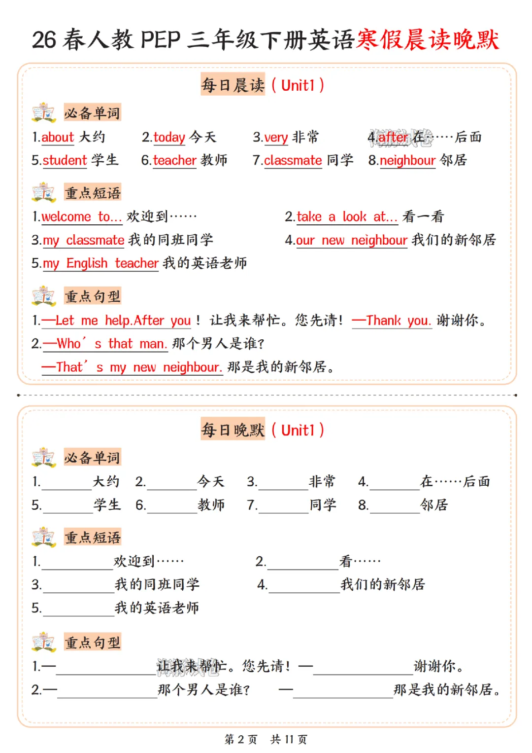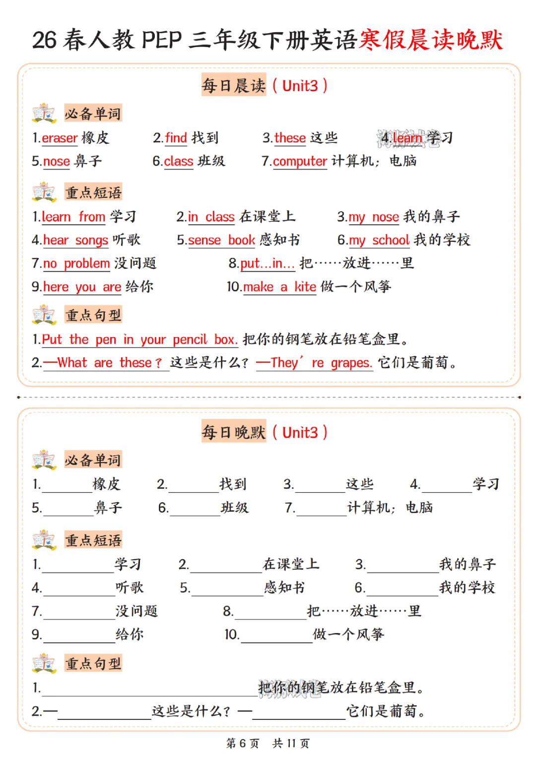 今日给大家分享26春《新三年级下册英语人教PEP版晨读晚默》电子版可打印。本资料是 26 春人教 PEP 版三年级下册英语寒假配套学习资料,共 11 页,按单元划分晨读、晚默两大模块,覆盖全册六个单元核心内容。晨读部分梳理必备单词、重点短语和核心句型,夯实基础词汇与句式;晚默对应晨读内容设置默写练习,以汉译英形式巩固记忆,学练结合。内容贴合教材考点,编排简洁清晰,晨读积累 + 晚默检测的模式,适配寒假英语预习与基础巩固,是三年级下册英语课前预习的实用资料。