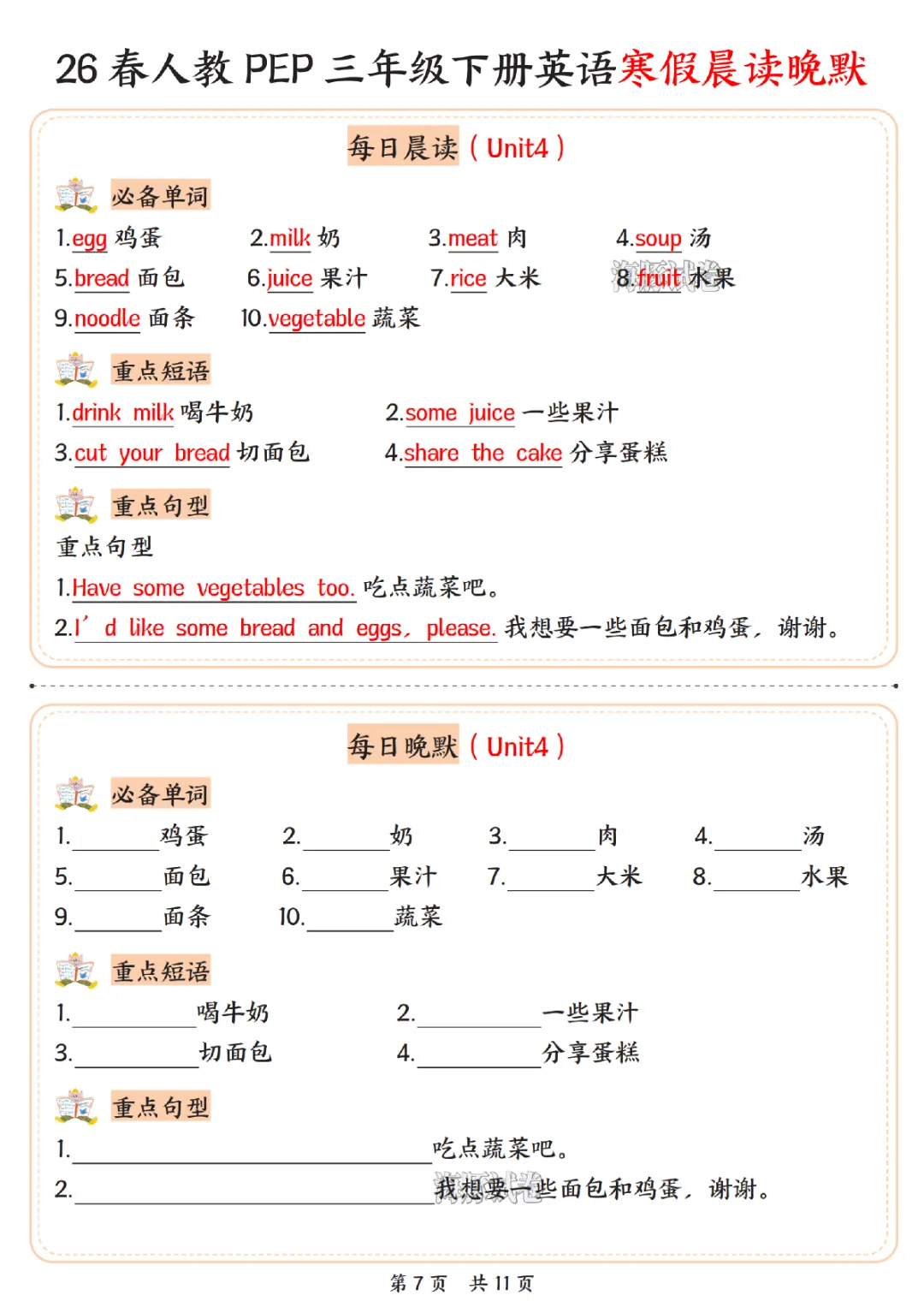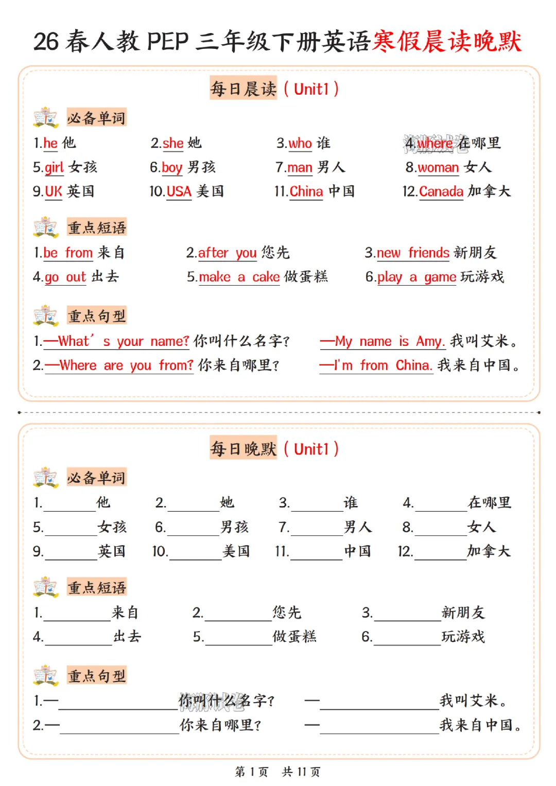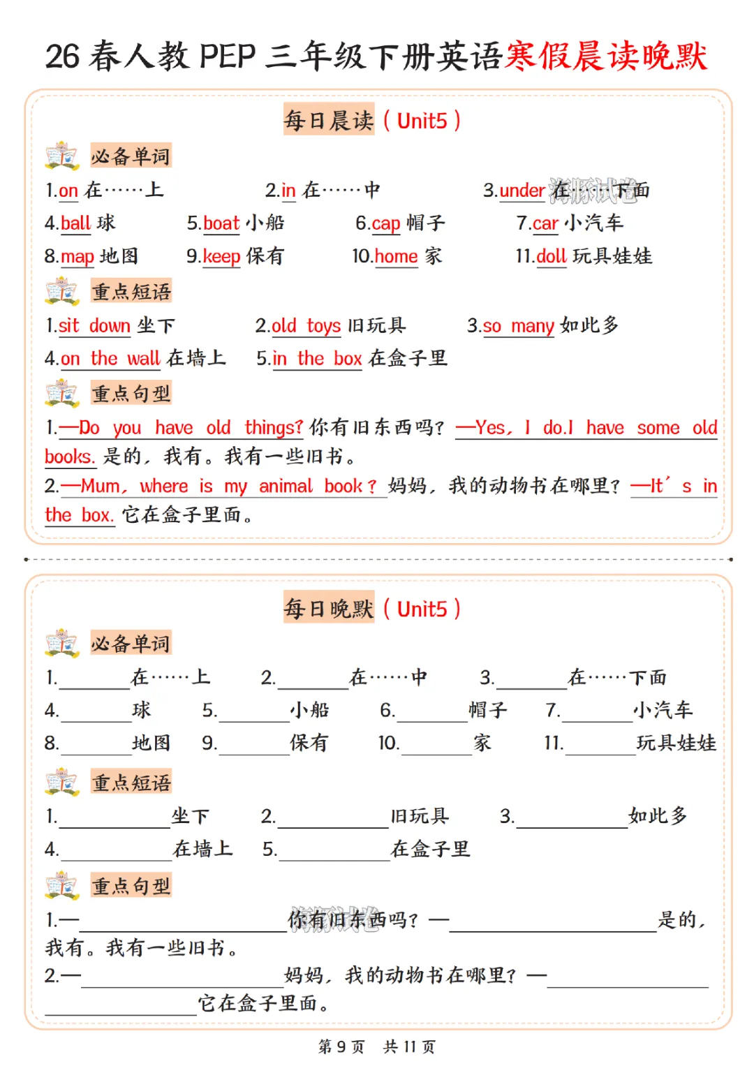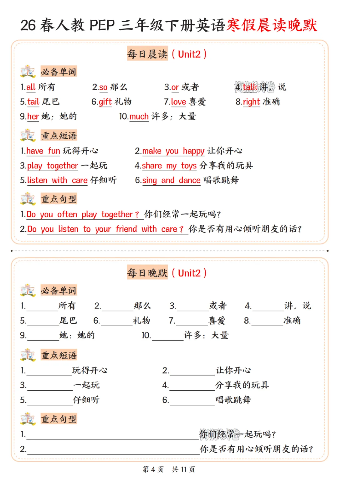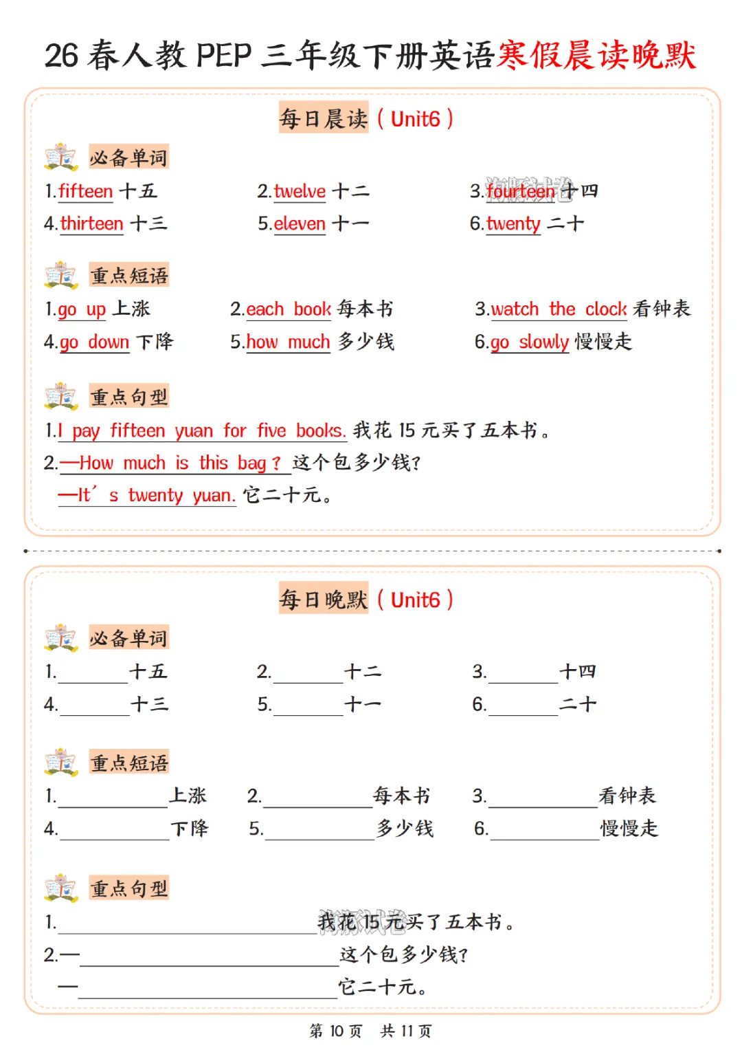 今日给大家分享26春《新三年级下册英语人教PEP版晨读晚默》电子版可打印。本资料是 26 春人教 PEP 版三年级下册英语寒假配套学习资料,共 11 页,按单元划分晨读、晚默两大模块,覆盖全册六个单元核心内容。晨读部分梳理必备单词、重点短语和核心句型,夯实基础词汇与句式;晚默对应晨读内容设置默写练习,以汉译英形式巩固记忆,学练结合。内容贴合教材考点,编排简洁清晰,晨读积累 + 晚默检测的模式,适配寒假英语预习与基础巩固,是三年级下册英语课前预习的实用资料。