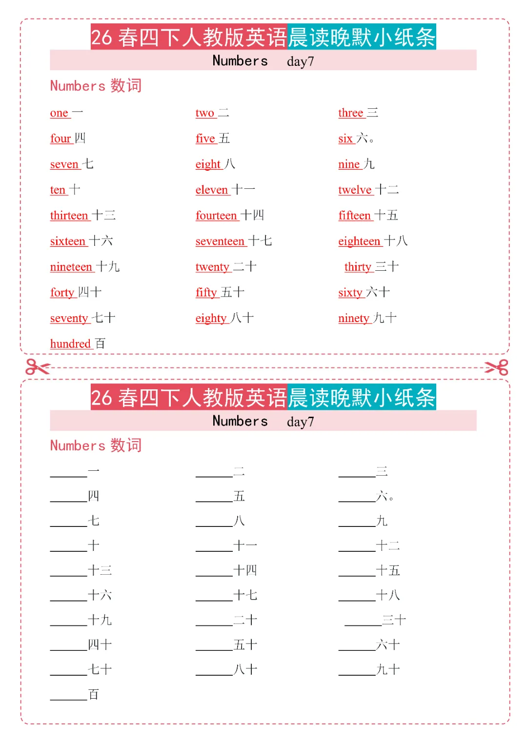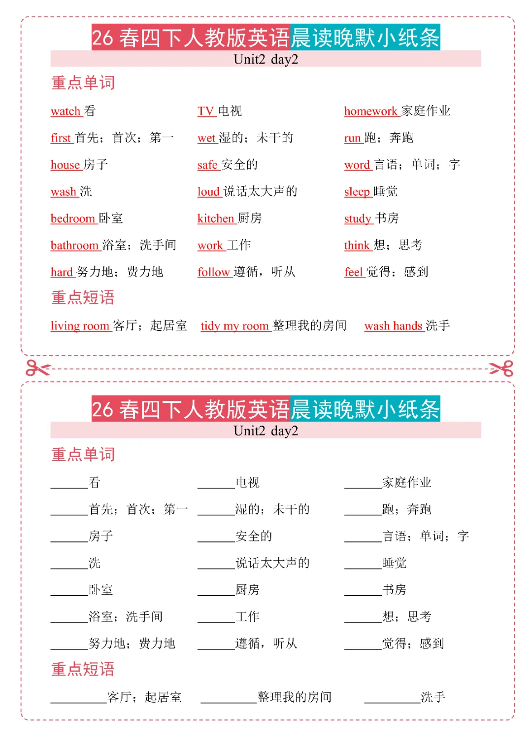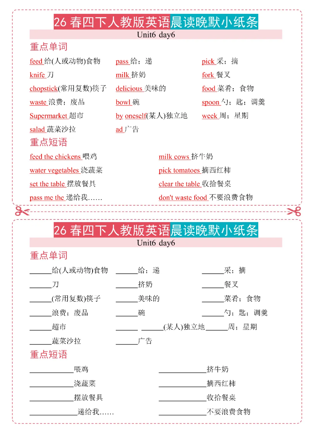 今日给大家分享26春《新四年级下册英语人教PEP版晨读晚默小纸条》电子版可打印。本资料是 26 春人教版四年级下册英语配套晨读晚默小纸条,按单元和天数划分内容,覆盖多单元核心知识点及数词专项。采用晨读 + 晚默对应编排,晨读梳理各单元重点单词、短语,晚默以汉译英形式复刻晨读内容,针对性巩固记忆。内容贴合教材考点,包含家居、时间、服饰、农场、餐具等主题词汇与常用短语,还单独设置数词专项练习,小巧便携,学练结合,适配日常晨读积累、课后默写巩固,是四年级下册英语基础夯实的实用资料。