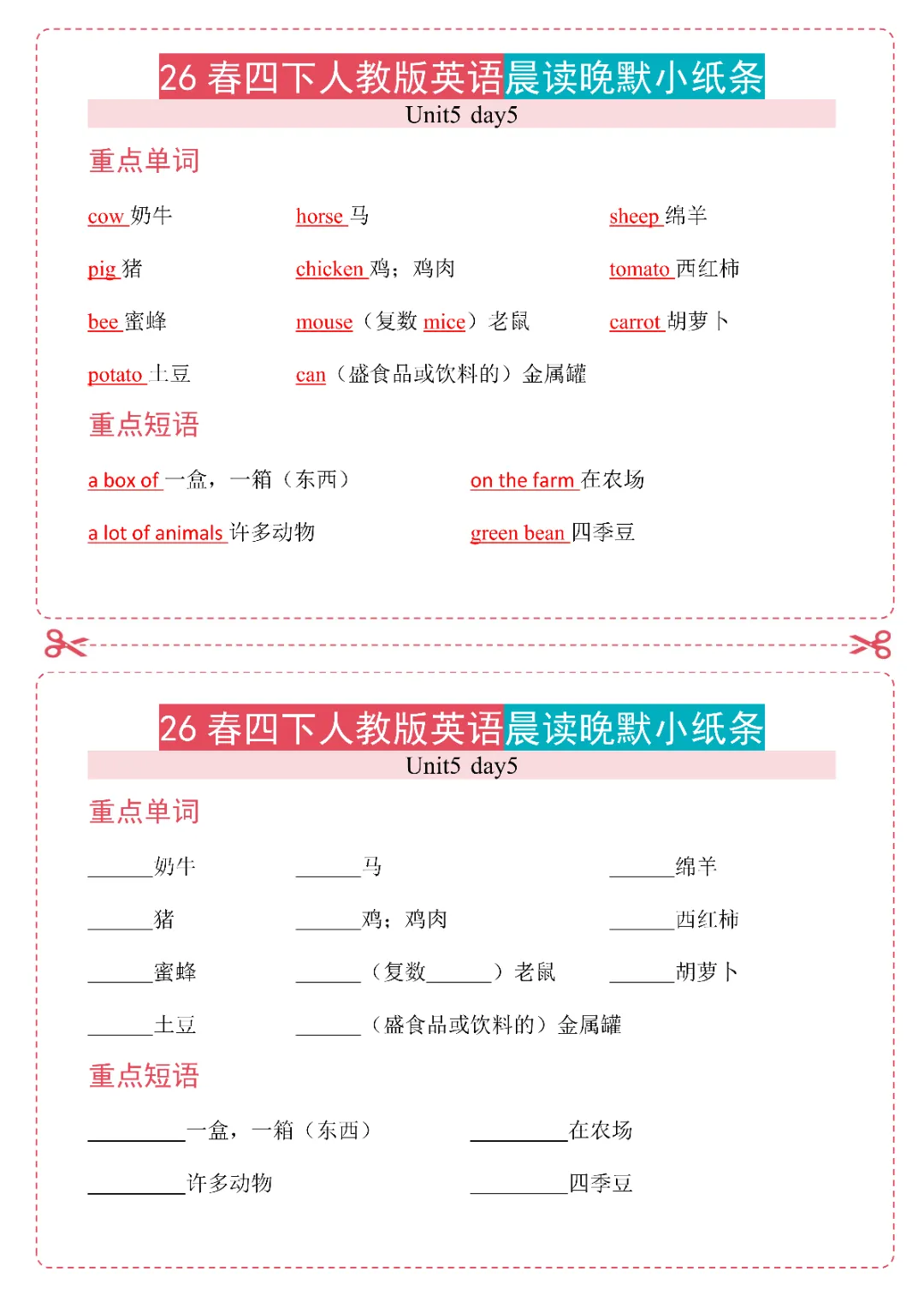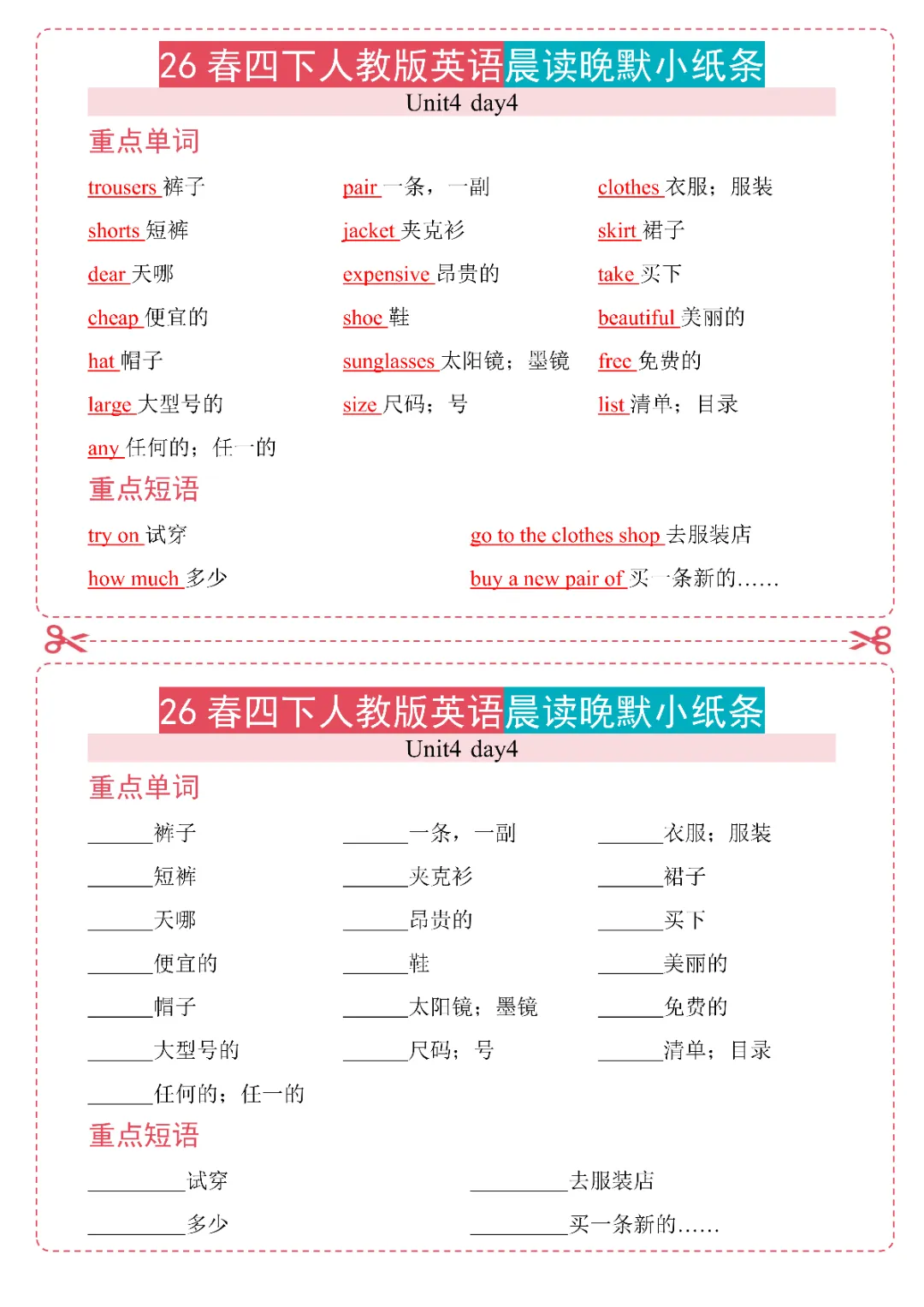 26春《新四年级下册英语人教PEP版晨读晚默小纸条》电子版可打印
