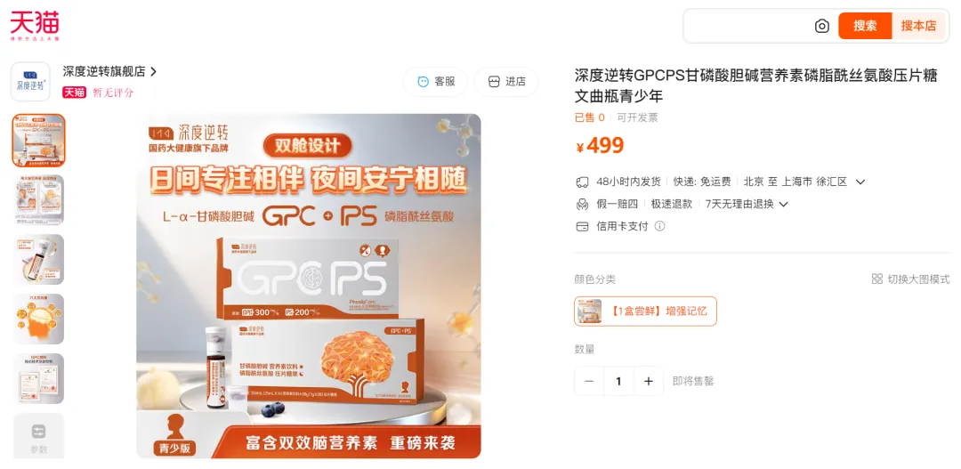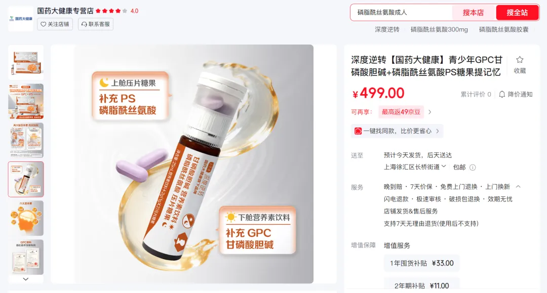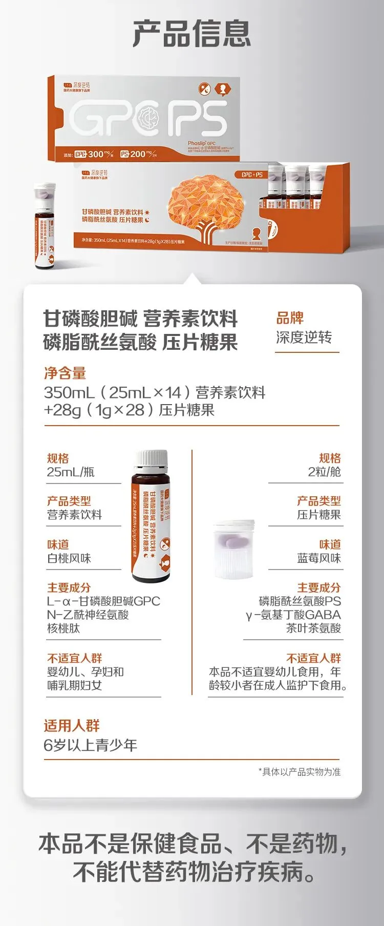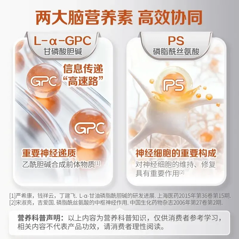 这款国药大健康旗下的“文曲瓶”,使用了甘磷酸胆碱复合饮(L-α-GPC)+磷脂酰丝氨酸压片糖果(PS)组合,就好像给这两个化学物质组了个一对CP ,给大脑配了个 “白天鸡血 + 晚上修复” 的专属管家。