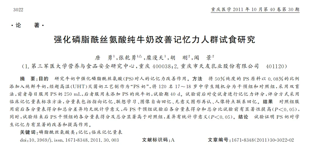 黄教授提及的一项针对重庆高三学生的论文,我把原文找出来了(上图)。这个实验是第三军医大学营养与食品安全研究中心针对120名重庆市高三学生(17-18岁)做的。得出的研究结论是:在连续40天服用强化100mgPS牛奶后,其语言和非语言的记忆力都有明显增强。
