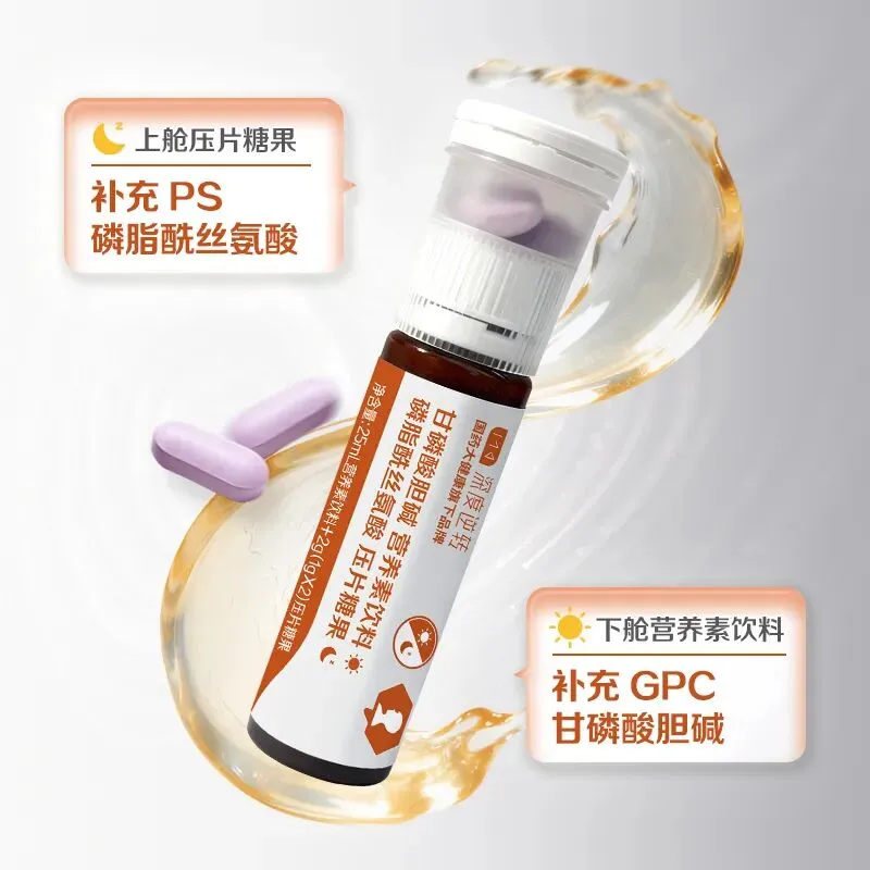 “文曲瓶”使用双舱设计:下舱是白桃味的 GPC 营养素饮料,早上空腹来一瓶,给大脑充满一天的能量。上舱是蓝莓味的 PS 压片糖果,睡前两粒,200mg PS 搭配 GABA 和茶氨酸,既能巩固白天的记忆,又能让紧绷的神经放松下来,一夜好眠。