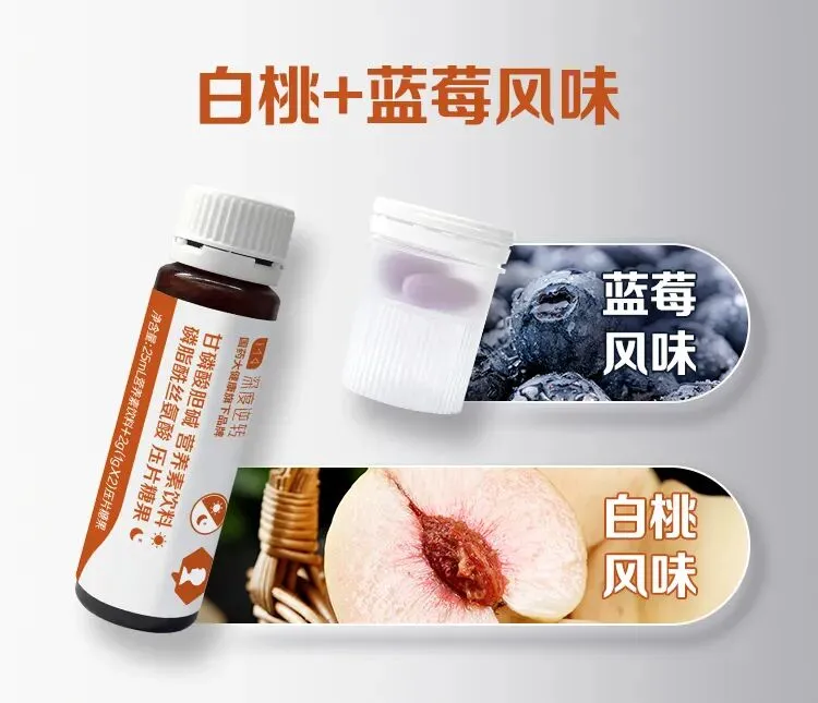 甘磷酸胆碱复合饮是白桃味道,磷脂酰丝氨酸压片糖果是蓝莓味,都是娃喜欢的酸酸甜甜果味。