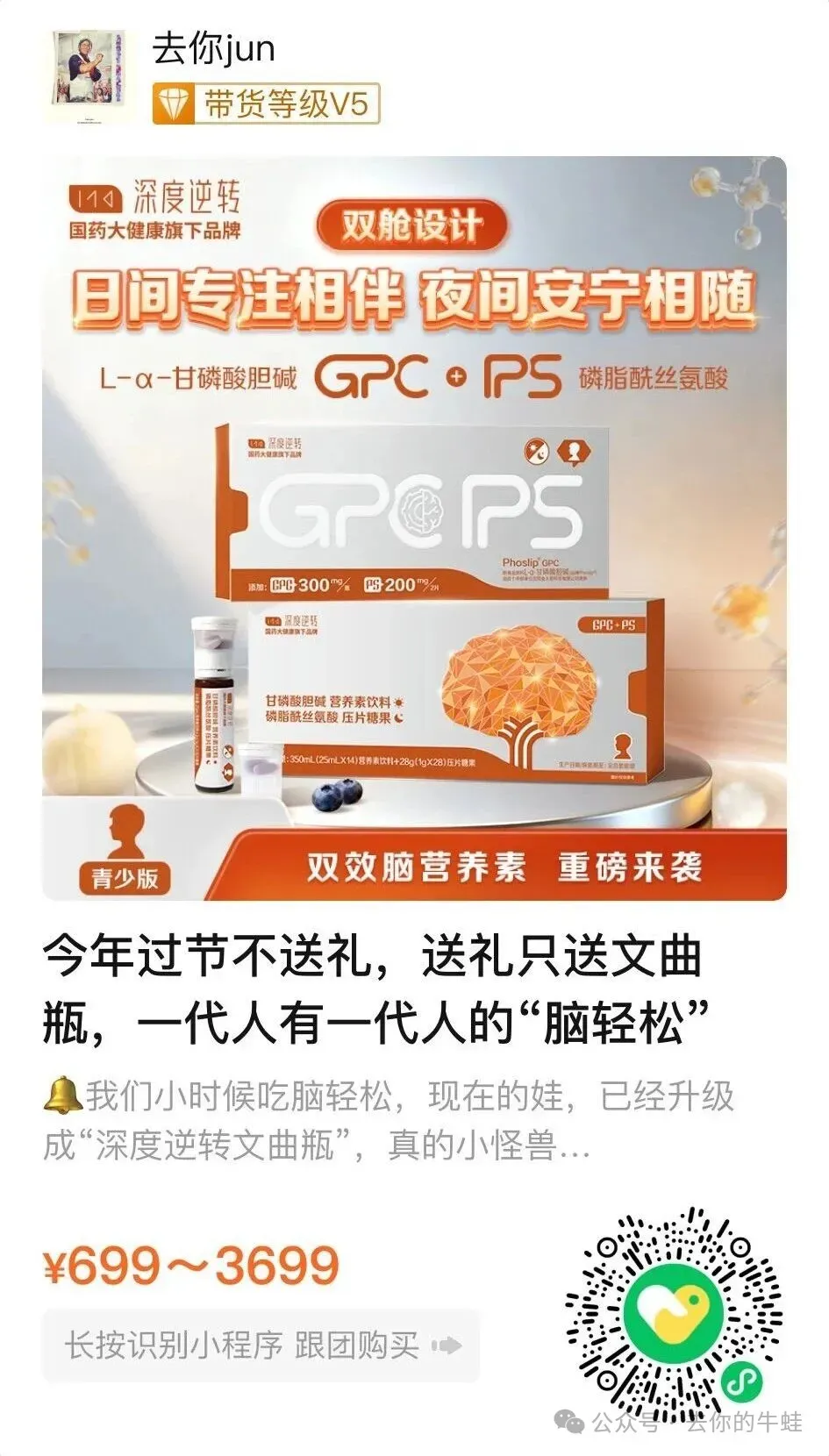 年前,闺蜜快递来的国药大健康旗下的脑营养素“深度逆转文曲瓶”,针对性补充L-α-甘磷酸胆碱和PS(磷脂酰丝氨酸),效果挺好,相当于给大脑配了个 “白天鸡血 + 晚上修复” 的专属管家,白天学得专心,晚上睡得安心。
