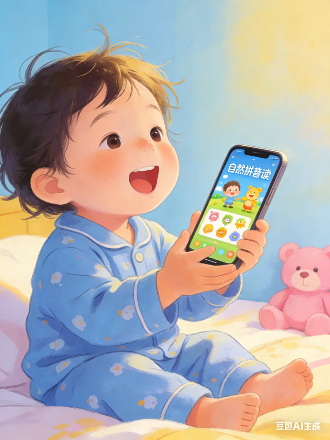 适配插画:温馨居家风,90后宝妈陪娃坐在地毯上,手机打开小程序界面,娃指着屏幕跟读,旁边散落着玩具,色调柔和治愈,无文字对话框
