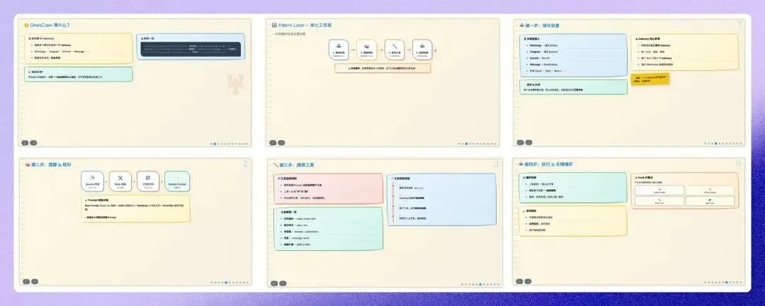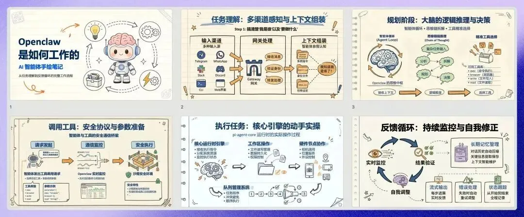 帮我做份Sketchnote风格的PPT,主题《Openclaw是如何工作的》,用手绘图标、箭头、流程图这些元素,把Openclaw的工作流程讲清楚,包括任务理解、规划、工具调用、执行和反馈这些环节,整体要像手绘学习笔记,信息丰富但结构清晰,让新手也能看懂。