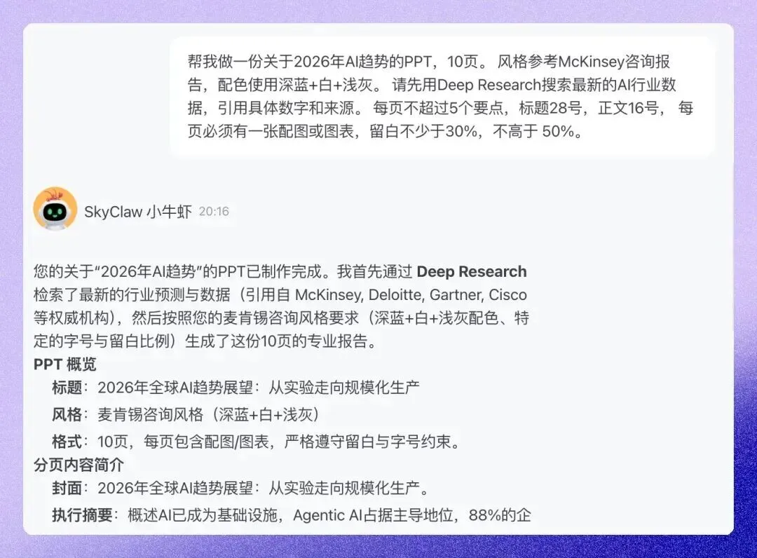 我现在每周一早上打开SkyClaw,桌面上就躺着做好的周报PPT——数据自动拉,图表自动更新,我只需要扫一眼确认没问题。