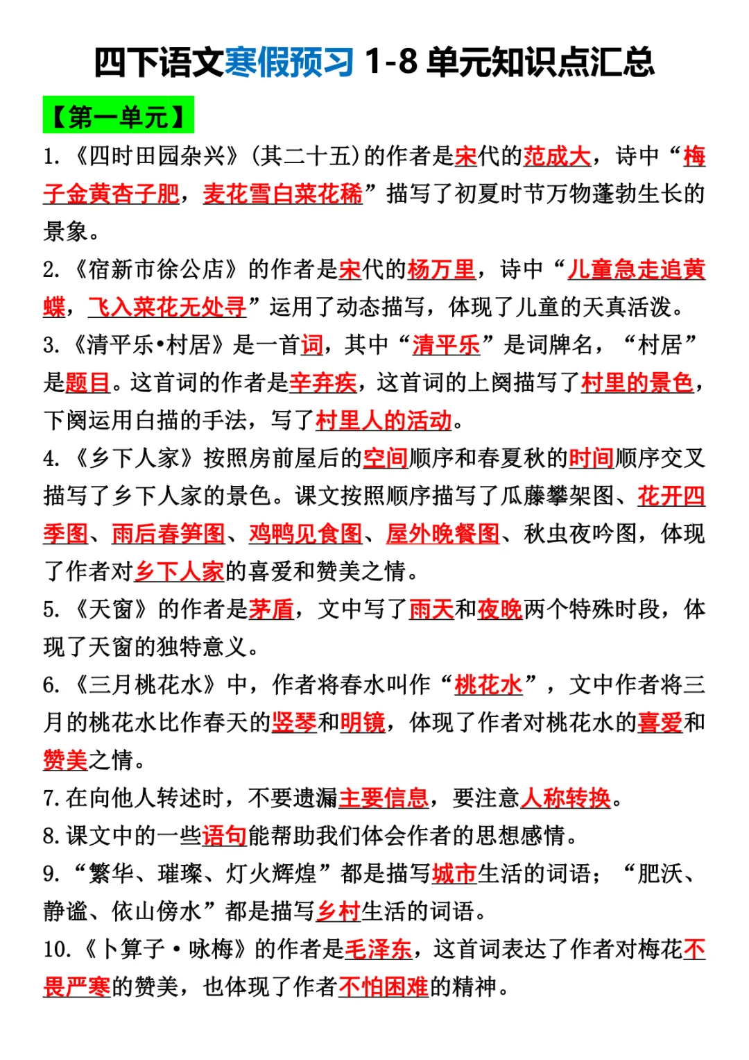 四年级(下)语文 1-8单元知识点汇总电子版PDF,6页,免费下载