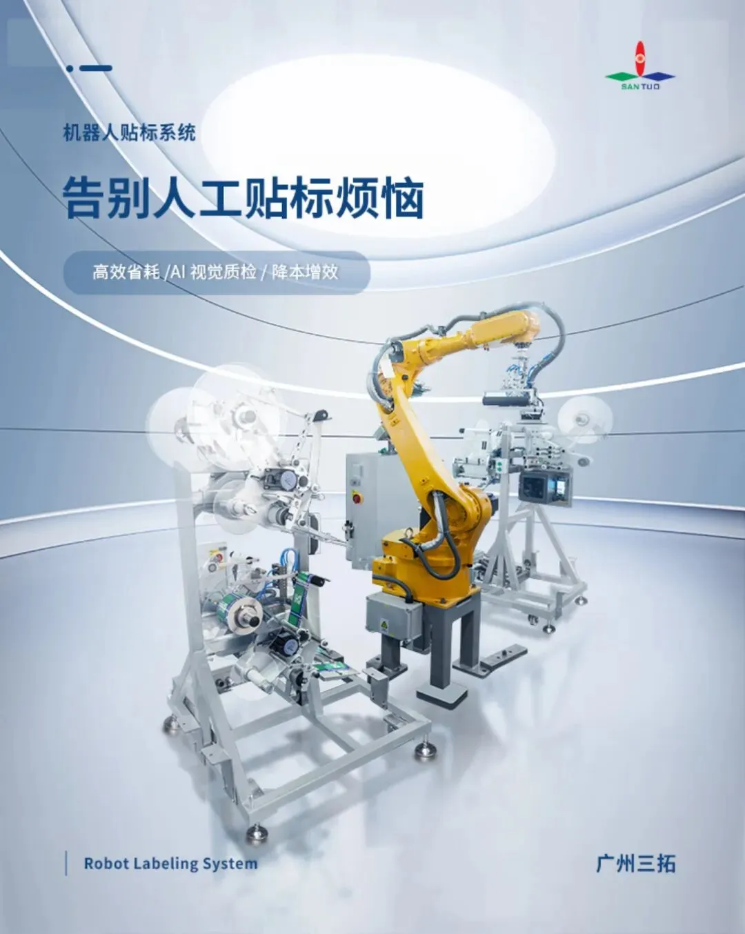机器人贴标系统,以智能化、高稳定性、高适配性,为企业打造高效、省心、低成本的自动化贴标解决方案。