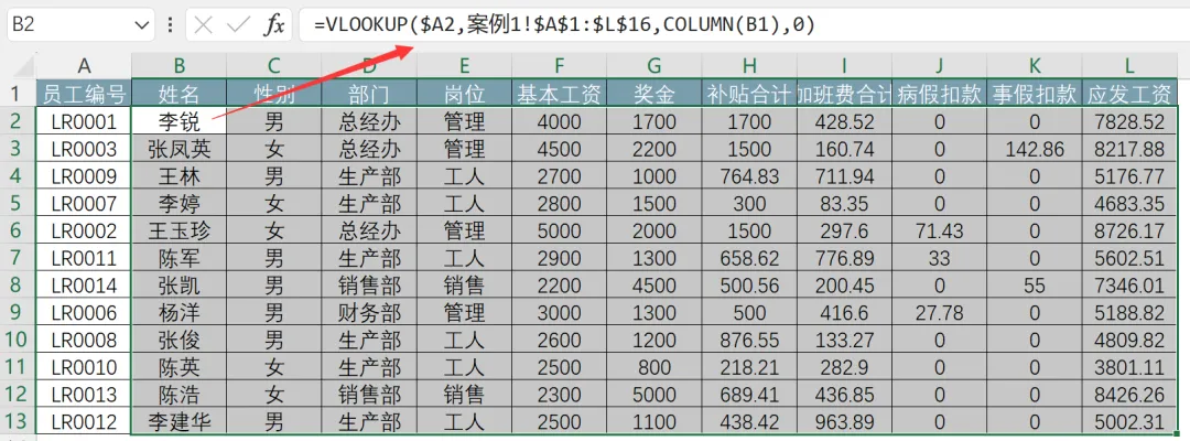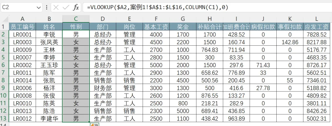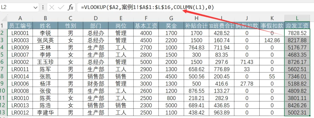 “应发工资” 数据位于工作表 “案例 1” 中的第 12 列,而公式的第三参数 “COLUMN (L1)” 正好返回 L 列对应的列号 12,所以实现了用一个公式查询 11 个字段信息。