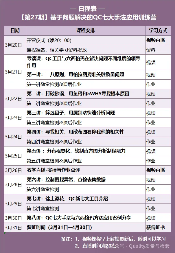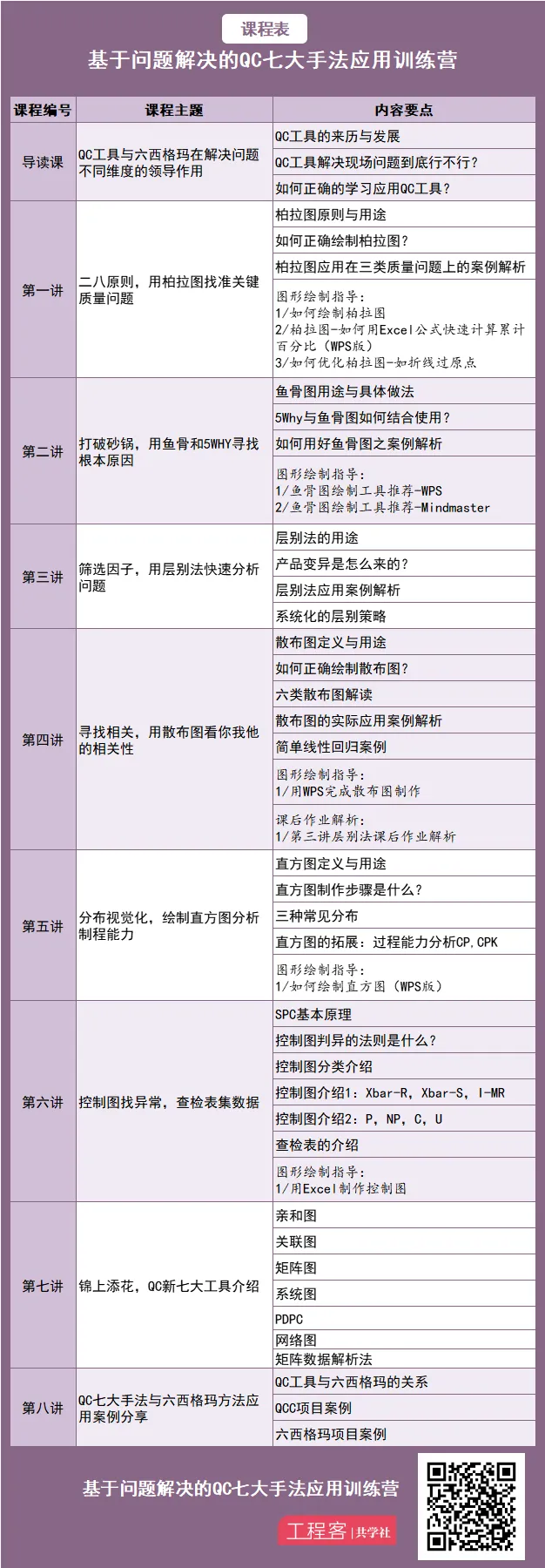 工程客共学社特邀资深专家渠良老师,带来《基于问题解决的 QC 七大手法应用训练营》——从老七大的 “数据可视化”,到新七大的 “结构化思维”,手把手带你从 “听懂” 到 “会用”,真正把QC工具变成你解决问题的核心竞争力。